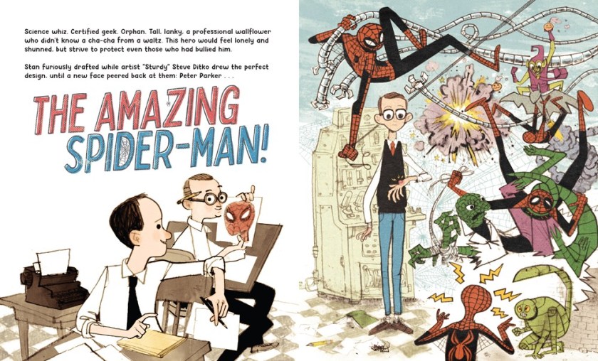 Gone but never forgotten (or, if you’re like me, maybe you prefer to think he’s hanging out with The Watcher somewhere), Stan Lee changed the faces of comic books forever: from The Hulk and the Fantastic Four, to the X-Men and the Avengers, he collaborated with industry giants like Jack Kirby and Steve Ditko, to give us heroes that were super AND human. With Great Power is a wonderful tribute to our “generalissimo”, beginning with Stanley Lieber’s spare childhood in New York City, his job at Timely Comics, which, along with his love of books and fantasy led to him becoming an editor while still in his teens, and ultimately, his work creating superheroes that have since become household names: Spider-Man, Iron Man, Doctor Strange, Black Panther, and so many more. The book even mentions “Stan’s Soapbox”, a column in Marvel comics where Stan would take on issues of the day like racism, sexism, and enjoying comics, no matter your age. (You can also buy the collected Soapboxes!) The comic book artwork is loaded with heroes that even casual fans will recognize; toned in sepia as we look back to Stan’s earlier years, things come to life when his career takes off. There’s a diverse crowd thronging as he walks a red carpet, a host of Marvel superheroes following him, and he’s surrounded by a diverse group of superhero fans, dressed as their favorites, at the story’s close. Back matter includes some more Stan facts and a bibliography, and endpapers are a collection of comic book exclamations, which you’ll also discover as you read the story. A fitting tribute for a man who gave his life to comic books. Make sure to check out the free activity guide. Display and booktalk with Boys of Steel by Marc Tyler Nobleman; the book profiles the lives of Superman creators Joe Shuster and Jerry Siegel.