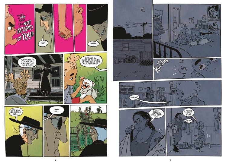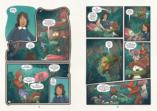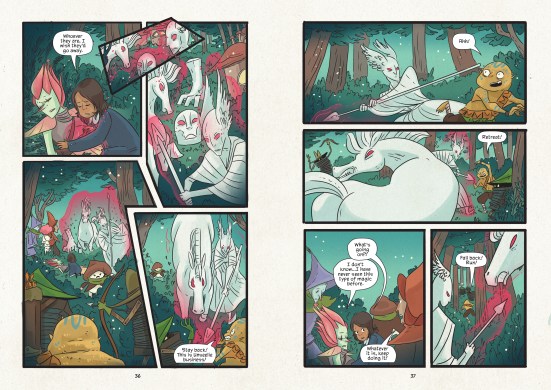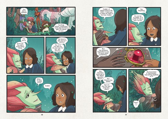 Snapdragon is a story with depth. Lumberjanes writer Kat Leyh creates a magical, yet real cast of characters: Snapdragon, the daughter of a single working mother, is bullied at school and by her mother’s cruel ex-boyfriend. Her friend, Louis, who prefers to go by Lulu and wear skirts and nail polish, is tormented by his brothers. The two bond over their mutual love of a a horror movie series and Lulu finds comfort and safety in Snapdragon’s home. Jacks and Snap discover a connection between them in a subplot with Snap’s grandmother.