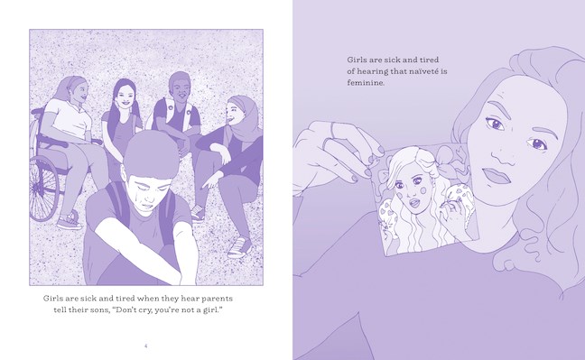 Geneviève Darling’s purple-and-white artwork gives visual understanding to Lucile De Pesloüan’s words and ideas, featuring  diverse, inclusive groups of women to get the points across. Girls and women are not cookie-cutter templates: we are different, have different tastes and experiences, come from different cultures and backgrounds, and have different ideas and beliefs. We don’t all want to be rescued, and we don’t want to be someone’s “score”. We don’t like it when you assume we’re weak, when you tell boys and men to “man up” or “stop crying like a girl”. We don’t want to be told to “act like a lady” or, for that matter, what a lady is, does, or looks like. These moments, and many more, are intelligently captured and plainly stated. It’s a powerful, smart book that I hope will inspire young women – and men – to read, discuss, and move forward with understanding. There are no solutions presented here: that’s for us to take on.