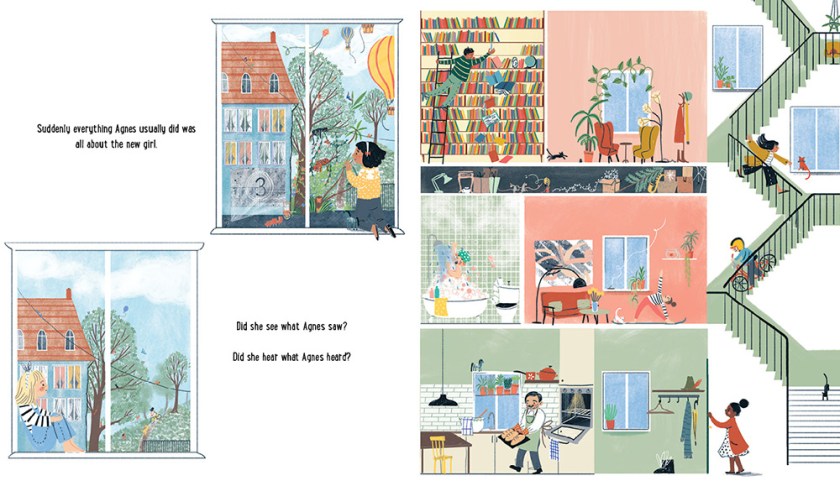 Agnes wakes up every day in her familiar home, with her familiar life, but no one said it was always exciting. When you don’t have anyone to play with, and you’re the “only child in a place full of adults who never have time” it can be quite sad. So when a new little girl moves into the building, Agnes is thrilled and sends her a message – it’s really just a drawing of the swings at the park, and the word, “Here!”, but it should get the message across, right? After a few days of waiting, Agnes is disappointed and a little frustrated – not only did the little girl never respond, but now she’s taking over things that Agnes used to do, like play with Amadeus the cat, feed the birds, and fetch Emilia’s newspaper from the mailbox! Will Agnes and the little girl, named Anna, ever meet and get to play together?
