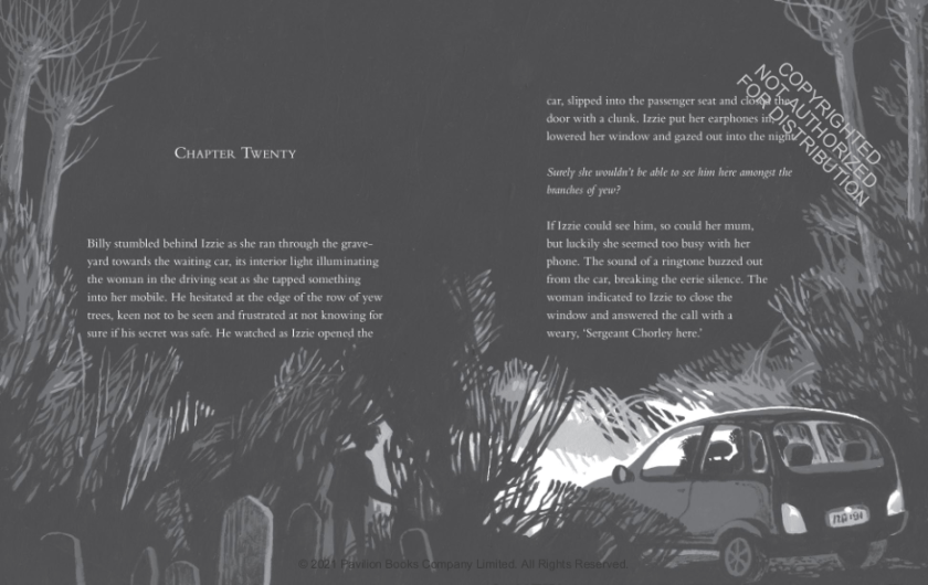 Pam Smy breathes incredible life into her characters. Grace, Billy’s mother, is a strong, smart woman who learns to take back her power, discovering that asking for help is the first step in recovering that power. Billy is conflicted, a victim of trauma who escapes for his own sake, but struggles with the guilt of leaving his mother behind. Supporting characters steer the two toward good decisions, never forcing either into actions they aren’t ready to take. Billy addresses toxic masculinity by throwing off Jeff’s verbal barbs about “manning up”, and takes action when he sees a potential assault in the cemetery one night. Grace remembers that she had the strength to go it alone with Billy once before, and is fully prepared to do it again. Pam Smy creates moody, ethereal landscapes with her black and grey illustrations. The event that Billy and the old man prepared for unfolds over several pages of pure illustration, which will grab reader’s hearts and hold on, staying with them long after they’ve closed the book for good.