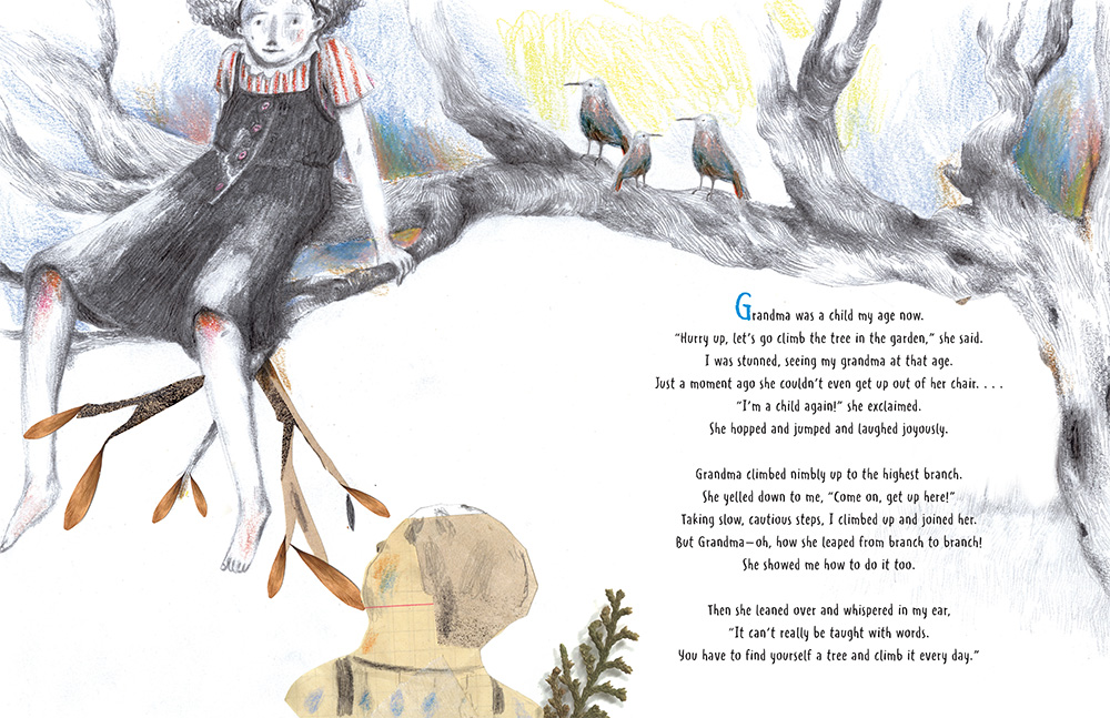 Senta Urgan’s artwork captures the essential moments, using pastels and collage to create living photos that exist outside the borders to reach out and draw both Grandma and Ali into their world. The artwork is the heartbeat to this fantastic story; Urgan uses real photos and illustrates a world around them, blending them together with photos and sketches, to create a dreamlike landscape where readers can play along with the characters. An essential story to have on hand to give to readers who may have aging family members.