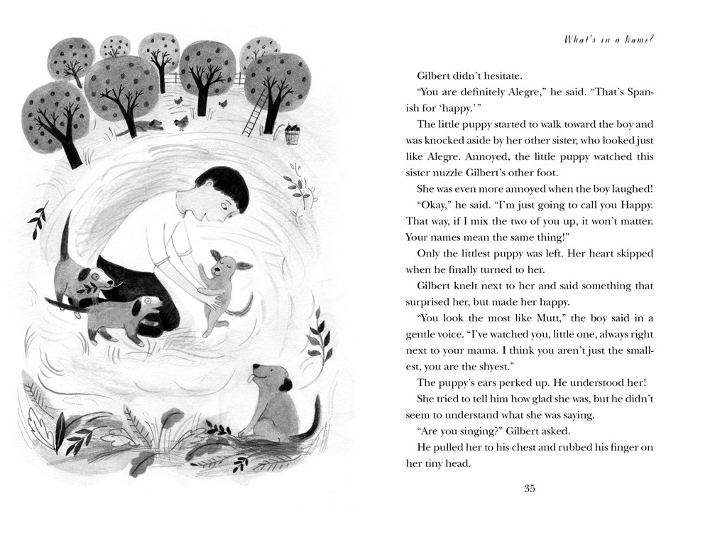 Mutt’s Promise is an unexpected book. It starts in a most idyllic setting, only to move pretty quickly into some heavy social issues. While the idea of migrant worker families is lightly touched on, it’s there, showing that this is not something that died out with The Grapes of Wrath. The heavier topic here is animal cruelty, most notably the kind of cruelty that takes place in puppy mills. Luna, a spunky little female pup, also deals with crushing depression and post-traumatic stress disorder from her time in the puppy mill. All of these topics are handled in an age-appropriate manner, framed within the animals’ story and using vocabulary that doesn’t try to sugar-coat what happens in these places, but makes the situation comprehensible to younger readers.