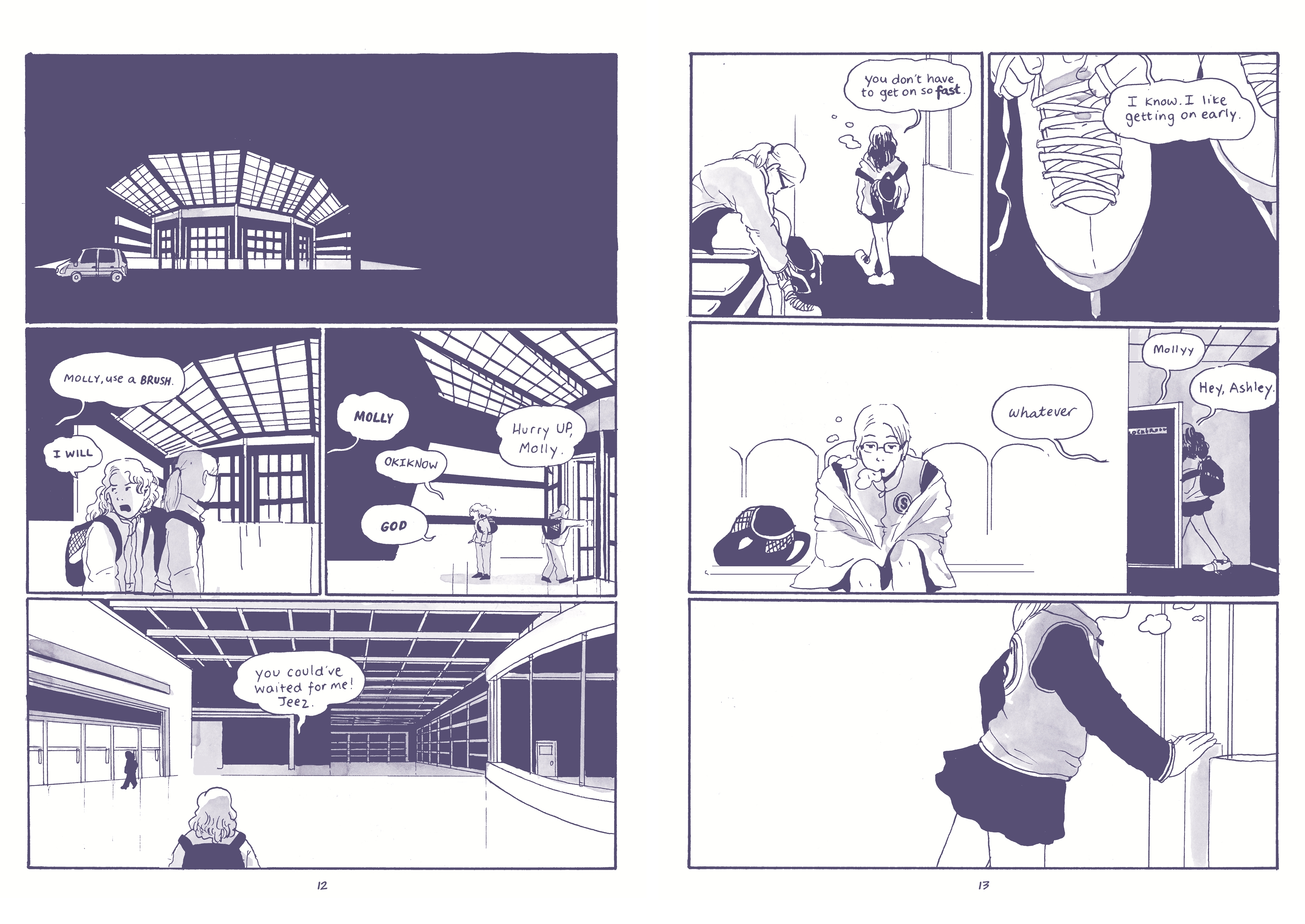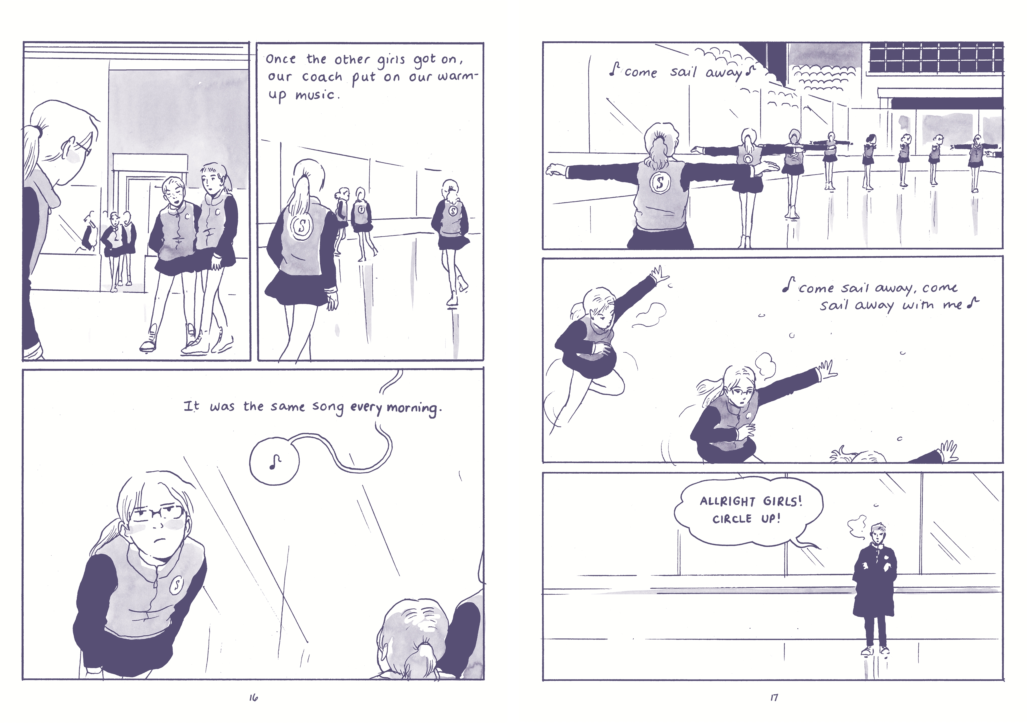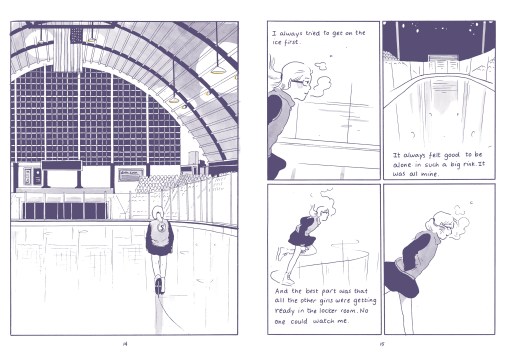 Sensitive but visceral, Tillie quietly tells her story. The rigor of her skating routine, the loneliness of practice and traveling without her parents and the stress of competition. She talks about her first love, and the pain of enforced separation. It’s a coming of age story that teenagers will embrace. Tillie speaks plainly, but with powerful emotion underneath the surface. I felt her crushing depression and anxiety as I continued throughout the book; told in two-color artwork, Tillie’s often in the shadows or drawn solitary, alone, speaking volumes to the reader.
