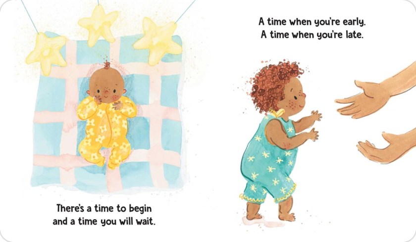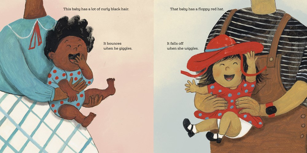 Told from a dog’s point of view, Dog’s First Baby is a board book with a fun spin on things as a family dog discovers someone new joining the household: a baby. Dog isn’t sure whether or not to be thrilled with this latest development, as baby’s front paws pull his ears and hurt; with time, though Dog sees that maybe the two aren’t so different after all: they both howl; they both like to play tug-of-war; they both enjoy a good stretch, and baby sure likes to share food, and, as Dog says, “I admire this”. A great book for new parents who may be getting ready or are in the early stages of introducing a new baby and a dog, Dog’s First Baby embraces the chaos of those early months: Baby dropping food all over the floor (which Dog happily cleans up); Baby and Dog howling and wailing together; Baby attempting to ride Dog; Baby and Dog making messes together. The book also captures those moments that are worth every mess: Baby asleep on Dog’s flank; the two sitting in a chair together, and Dog’s quiet presence whenever Baby is near, whether they’re walking together or sleeping in the same room. Deep, rich colors and textured lighter colors make this a beautiful book to look through.