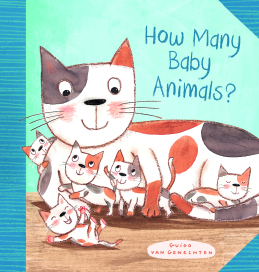 Originally published in 2016, this is the English translation of Guido van Genechten’s original Dutch. His artwork is child-friendly, with gentle, cartoony faces and smiles. Endpapers with frolicking baby animals bring the reader right into the fun, and the sturdy paper stock will hold up to exploring little hands, who will love turning the half pages back and forth to see each mommy animal with a round belly, and later, surrounded by her babies.
