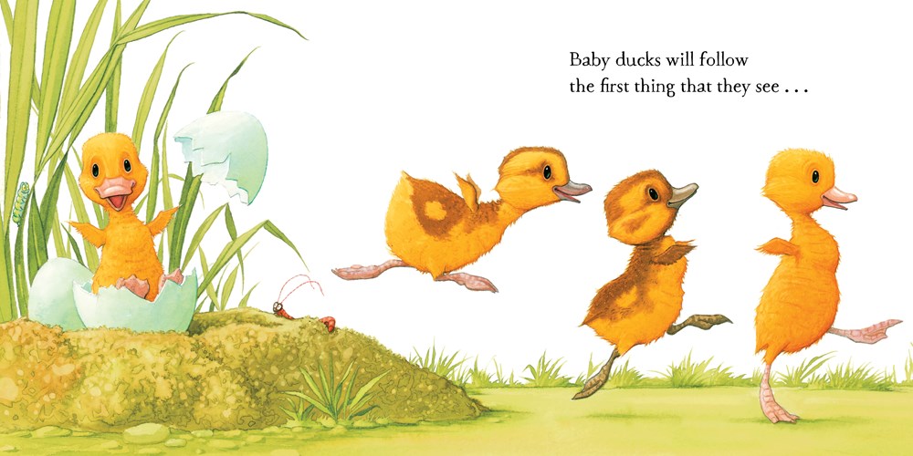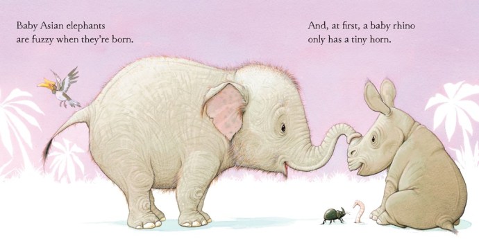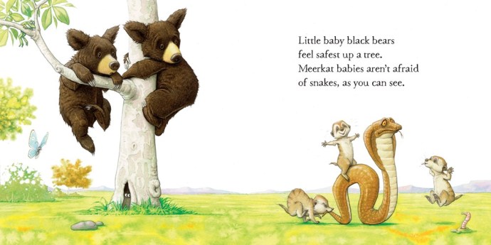 This adorable board book features squeal-worthy menagerie of baby animals, including ducklings, platypuses, koals, sloths, and meerkats. Rhyming text provides some factual info about the animals: baby ducks following the first thing they see; father seahorses having babies, and a perplexed snake, surrounded by playful meerkats who aren’t the slightest bit afraid of it. The illustrations are adorably realistic, and the text is just right for babies and toddler storytimes.