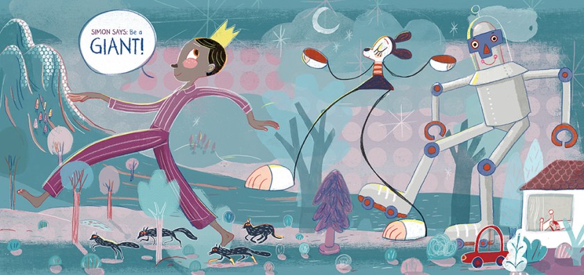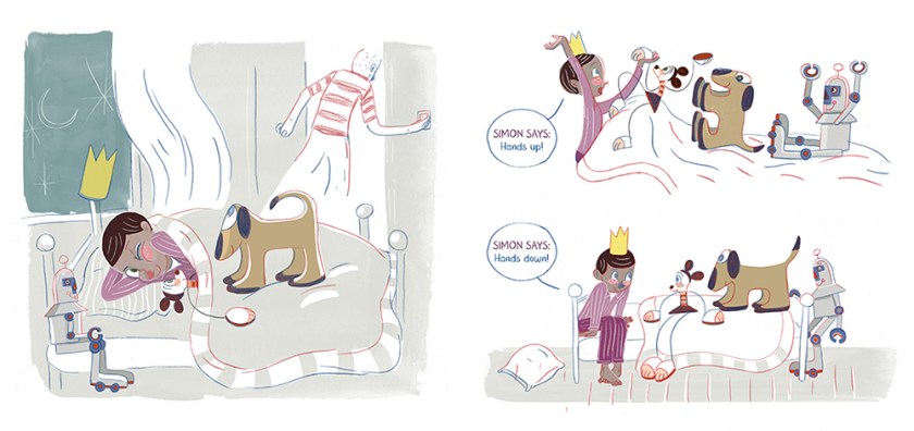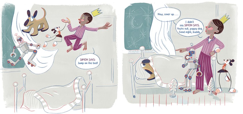 Part of the I Like to Read series of comics, this is a great introductory graphic novel for emerging readers. A parent and child are reading before bed when a blackout strikes. “Too dark!’ the child says, as the flashlight’s batteries die. The parent has an idea: climbing up to the roof with a sack, they pull the stars from the sky to bring to the child’s room, but what will happen to the poor Moon, left in the dark all by themselves? A sparely worded graphic novel with panels and a breathtaking spread, Emberley creates a heartwarming story for emerging readers that’s as perfect for a bedtime read as it is for reading on one’s own. Emberley’s playful characters have appeared in other stories, including I Did It! and Let’s Go! and sport colorful pink-and-green striped pajamas and ear coverings, with colorful red noses. Sharp-eyed readers will notice the book of choice is Emberley’s father’s book, Go Away, Big Green Monster! (another storytime favorite). An excellent addition to beginner-level graphic novels, Night Light has starred reviews from Horn Book and Kirkus.