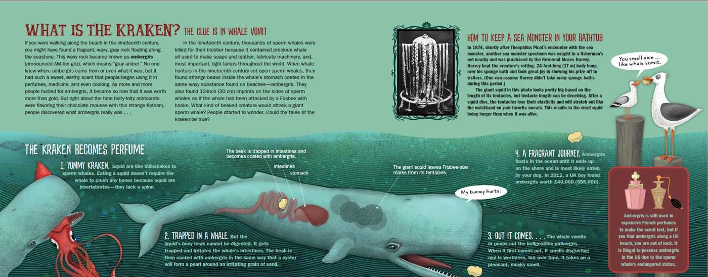 Okay, this is one of the best nonfiction reads I’ve read this summer. Eight movie monsters come together with witty writing, solid science and history, pop culture and myth, and amazing artwork to bring readers the “Science of the Monstrous”. Talk about electricity with Frankenstein’s Monster; whether or not science can make us immortal with Dracula (also, a spirited discussion on sparkly vampires); look at the zombie brain and pack a zombie preparedness kit while reading about zombie viruses; learn about math and whether or not you’re stronger than a dung beetle with King Kong; learn how to avoid – or, failing that, survive – a werewolf attack and read about the science behind the legend of werewolves; check out the ocean zones to figure out where the kraken dwells (and learn whether or not you’re about to be eaten by a giant octopus); talk evolution with Bigfoot while you scan a map of the US to see where your best chance of spotting him is; and, last but NEVER least, find out what kind of dinosaur Godzilla, King of All Monsters, is (hint: the awesome kind).