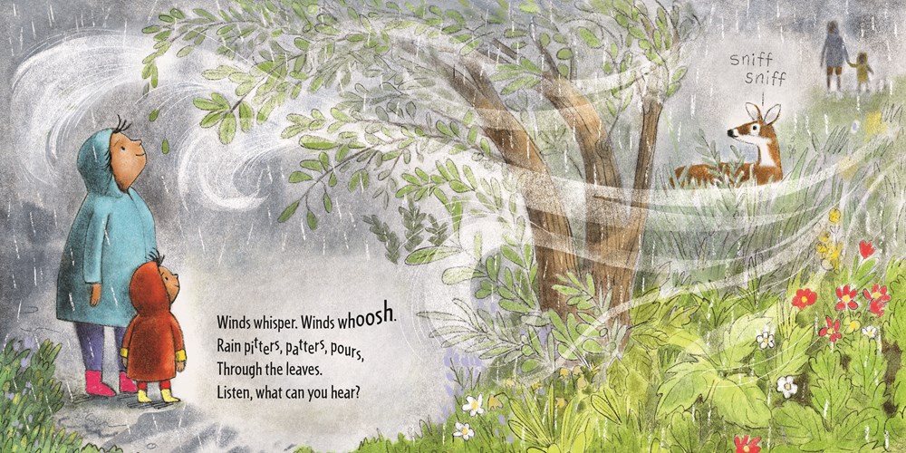 The companion book to Look, Listen follows a toddler and his parent as they go on a nature walk on a rainy day. The focus here in on the sounds around the two: “Winds whisper. Winds whoosh. / Rain pitters, patters, pours, / Through the leaves. / Listen, what can you hear?” The fonts play with language, stretching and bending to elicit sounds from readers. The repetitive question, “What can you hear?” invites readers to think about what the characters must be hearing, based on the verse, or even what they themselves hear in their environments. This is a great book to read twice in a seating if you can manage it: ask your readers to close their eyes and listen to a reading first, asking them, to form a picture in their minds of walking through a woodsy area on a rainy day. Animals add to the soundscape on each spread, as deer sniff, moles scratch, birds tweet, and frogs croak. The parent and child are people of color. Watercolor illustrations create a peaceful landscape and foster a love for nature.