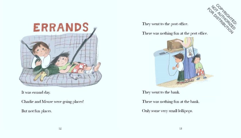 Siblings Charlie and Mouse have new adventures in their fifth outing. Lost & Found has four short stories, taking the sibs on slightly smaller – but no less exciting – adventures, all taking place in the course of one day. In “Somewhere”, the two search high and low for Mouse’s blanket; in “Errands”, they join Mom on the dreaded series of errands – the bank, the post office – but make a BIG discovery! In “Silly”, Charlie and Mouse have a sad goodbye, but in “Boop”, another discovery warms their hearts. Chapters are short, with simple sentences; stories are kid-friendly and oh-so relatable (the very mention of the words “bank”, “grocery store”, or “post office” strikes fear into my 9-year-old’s heart), Illustrations are softly illustrated, with friendly, expressive characters. The body language between the siblings is comforting and playful. The siblings slump on each other in the car during the dreaded errands; Charlie comforts a distraught Mouse, who cannot locate Blanket. Parents show up for a few moments in the stories, but the focal point is the relationship between Charlie and Mouse, as it should be. The first book in the series, Charlie and Mouse, is a 2018 Theodor Seuss Geisel Award winner.