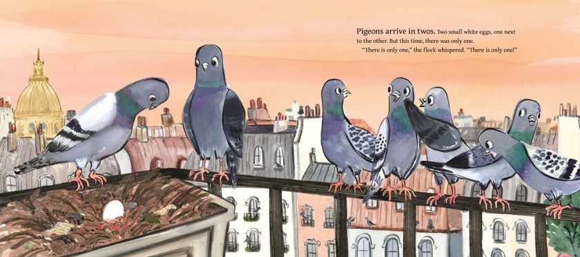 Seven, named because seven is considered a lucky name among pigeons, isn’t like the other pigeons. Most pigeons “arrive in twos”, but with Seven’s birth, there was only one. That alone set tongues a-wagging, but Seven is different in many other ways: he lets his sense guide him, leading him to craft nests of flower petals and being sidetracked by the delicious scents of a bustling French city. The other pigeons fret that he “he doesn’t nest. He doesn’t flock. And remember, there was only one”, but when the entire flock gets lost in a fog and starts to panic, it’s Seven and his wonderful sense of smell that guides him – and his flock – back to safety. A gentle story about navigating the world a little differently, Nickel’s storytelling is pairs wonderfully with Sicuro’s watercolor, goauche, and ink illustrations to tell a story that’s a feast for the senses. Pastel swirls entice Seven’s nose and transport readers to bustling city streets; expressive characters invoke pathos for Seven and will have readers cheering for him by the story’s close. I read this out loud to my storytime group last week and received a great response. An author’s note about pigeons makes up the back matter. Seven celebrates divergence and is an excellent purchase for social-emotional collections.