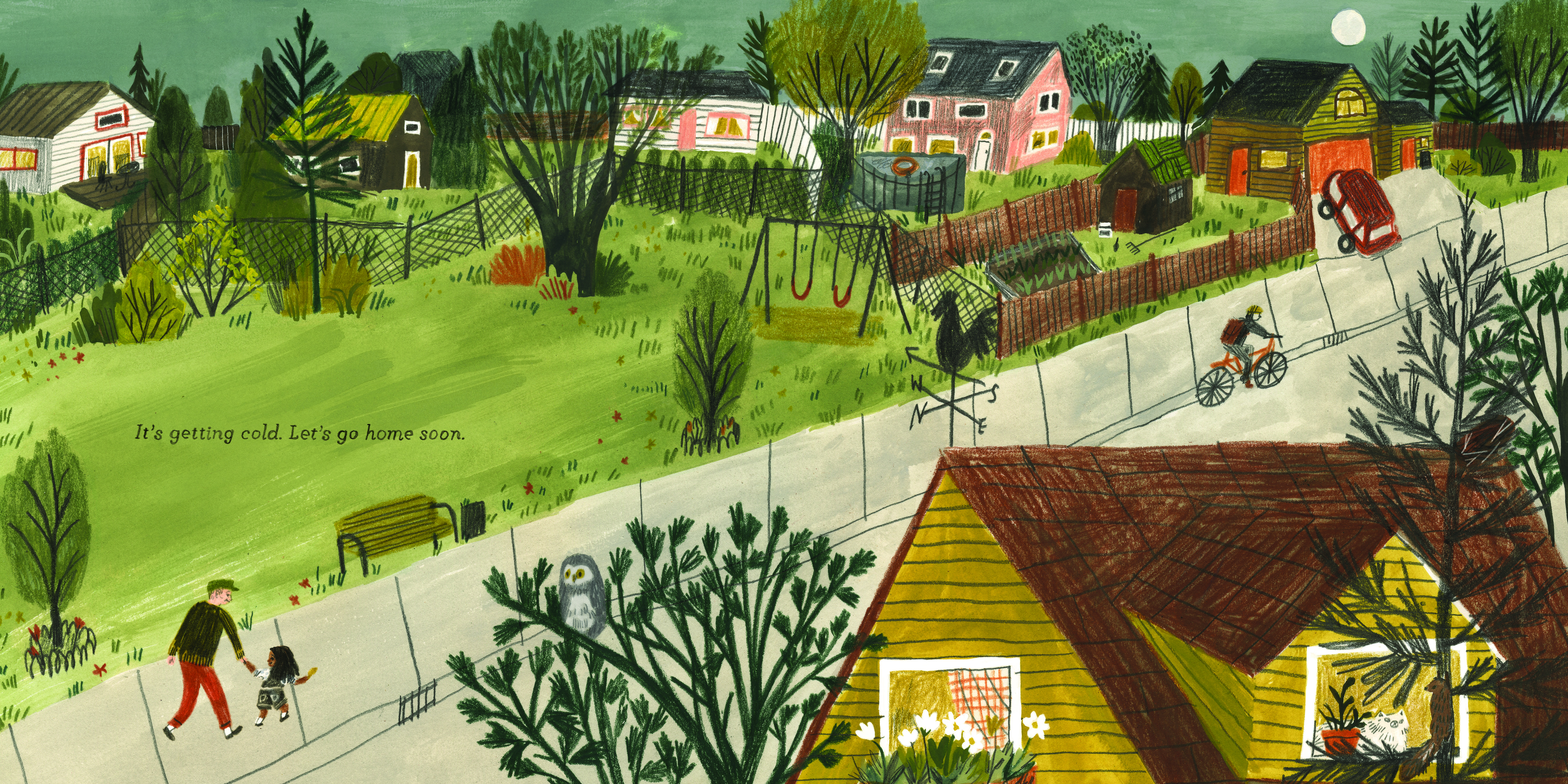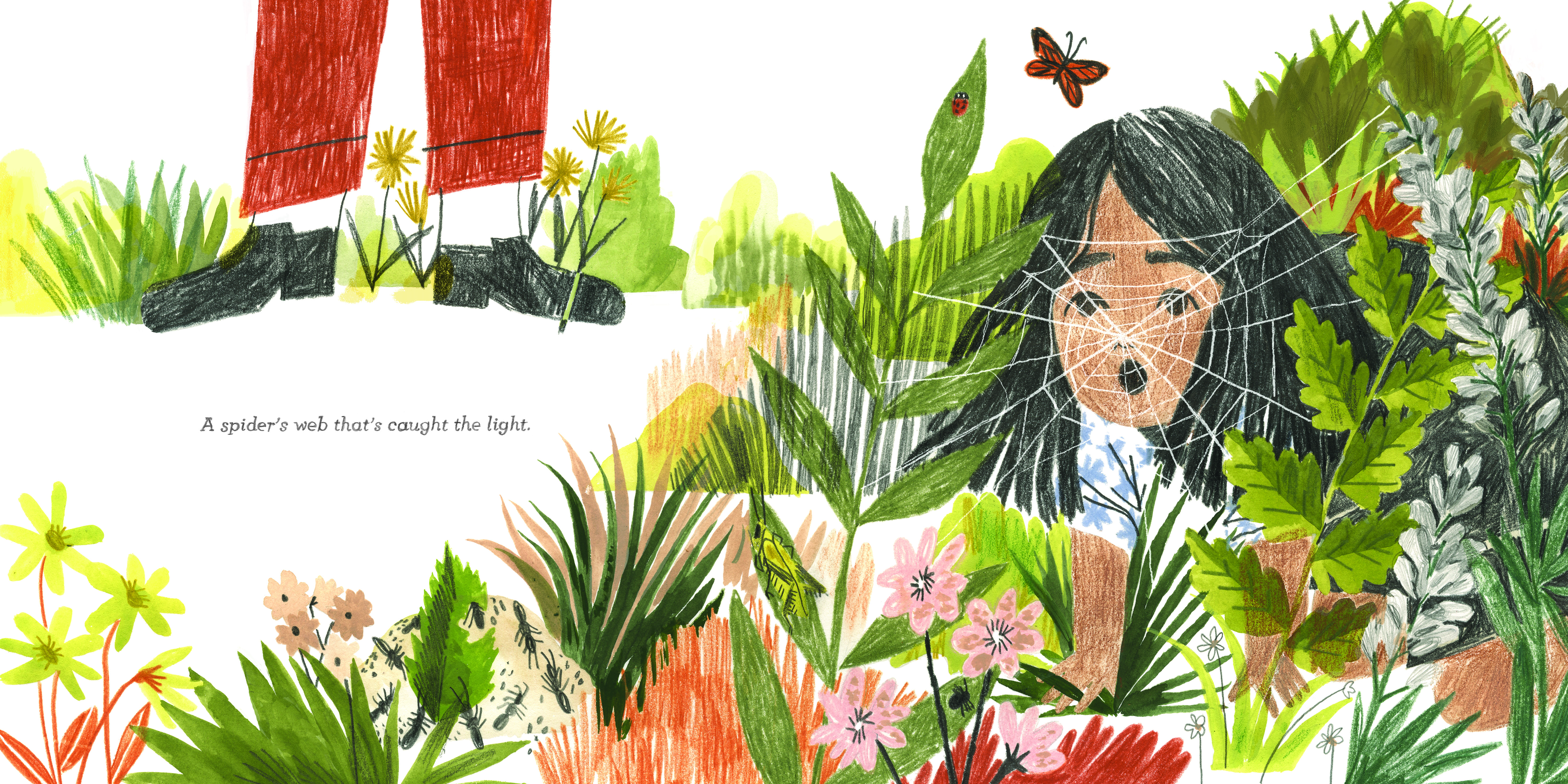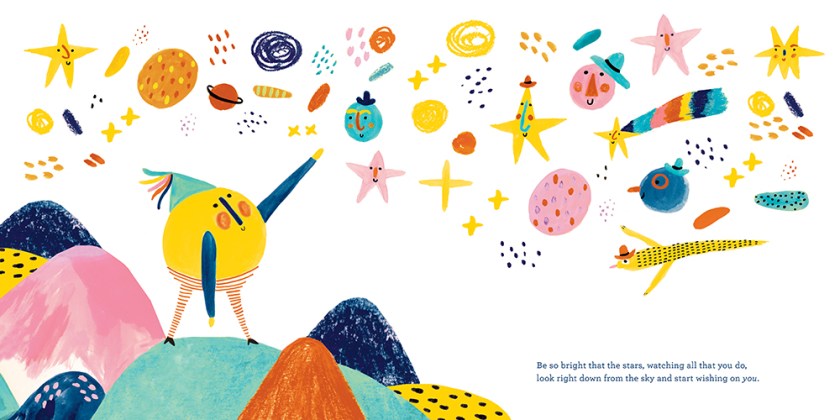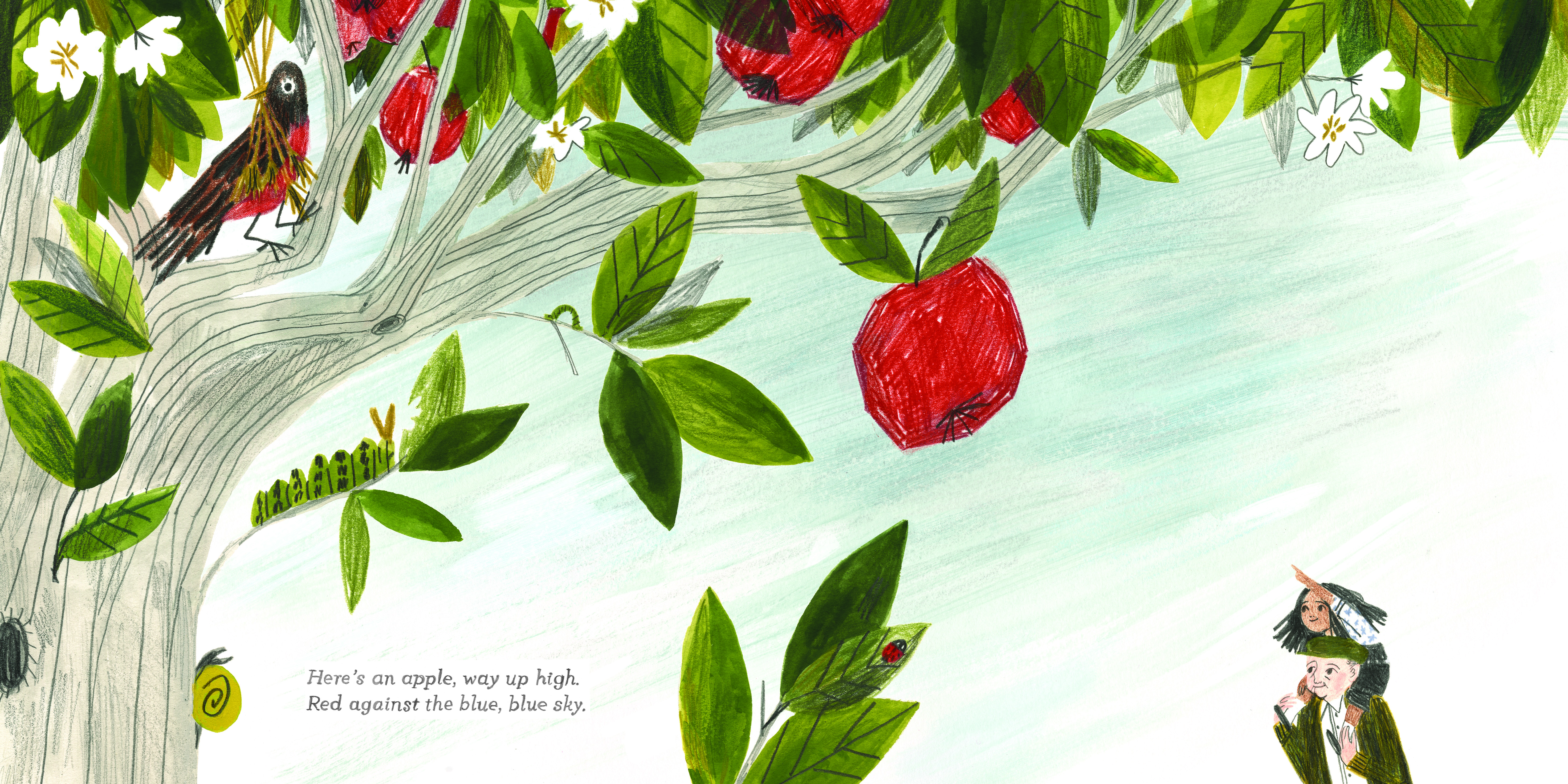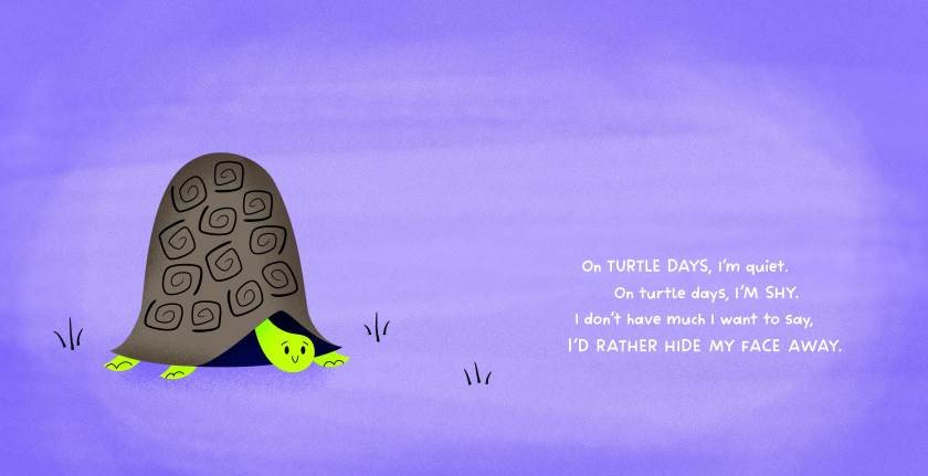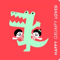 A boy, a girl, and their alligator demonstrate words to describe feelings in Happy Grumpy Loved. The children and alligator frolic their way through a bright red/pink background, introducing kids to words like friendly and shy; embarrassed and worried; pleased and excited. There’s movement, expressive body language, and a slew of great new words to get little ears used to hearing. The words map wonderfully to the illustrations, helping readers learn nonverbal communication, and develop empathy. The friendly girl waves at a dog, a big smile on her face; her friends hang back, heads cast down and the boy hiding behind the alligator, because they are shy. The dog barks, causing the alligator to leap into the air, surprised; he runs away, scared.