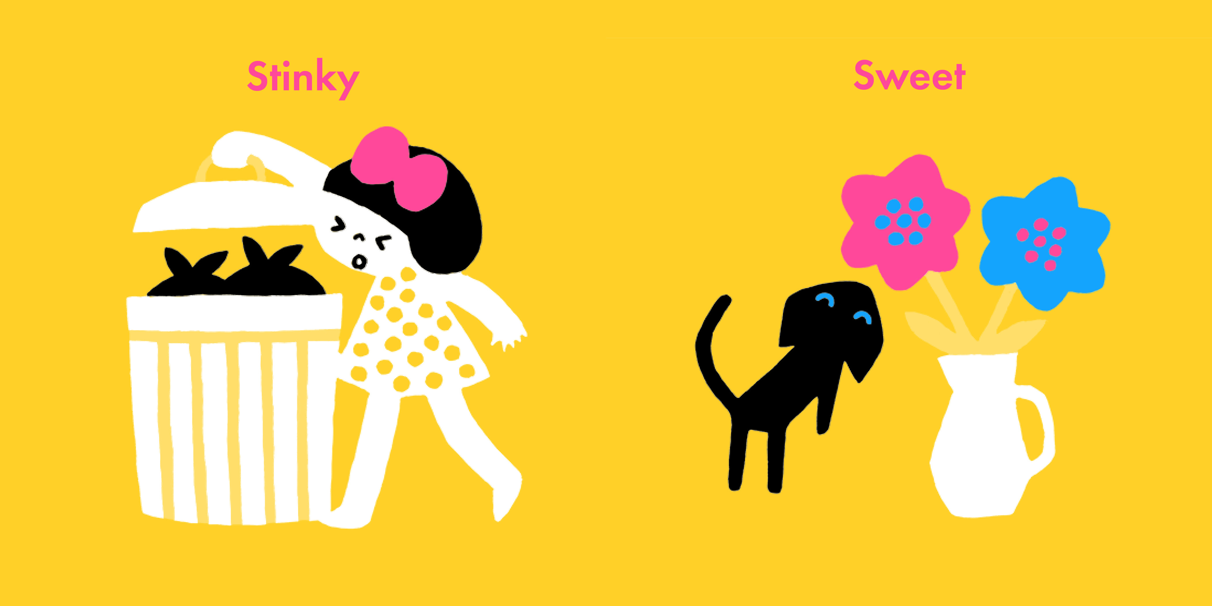 A young girl and her black cat introduce children to opposites in this fun little book. At the start of the day, the girl is asleep, until Kitty decides it’s time to give some morning kisses to awaken her. Throughout their day, the girl gives a piece of candy to the cat, who decides to take her slipper; the girl takes out the stinky garbage, while the cat smells the sweet flowers. Where the Wiggle Tickle Jump illustrations are set against a blue background, Hide Seek Stinky Sweet has bold illustrations set against a bright yellow background. The characters are cheerful; two friends enjoying a day together, and the bright, bold words pop off the page and make for easy reading.