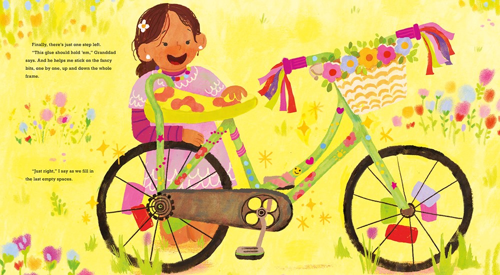 Joy is a little girl who needs something to keep her busy over summer vacation, so her mom sends her to her grandfather’s, where she finds a bike. Joy and Granddad work together on the bike: he fixes, she “fancies it up”, and when she takes that first ride, she’s enchanted: “Today I’m not just Joy: I’m JOY!!!” Sadly, other kids tease her, causing Joy to push the bike down a hill, but she soon realizes that the other kids all look alike. There’s nothing special about them. She fetches her bike, bringing it back to Granddad so she can ride again. A sweet story of individuality and taking a stand against bullies, Joy Ride is a wonderful multigenerational story, a tinkering story, a story about embracing what makes you happy. Digital illustrations are bright, colorful, bold; Rinker’s narration, told from Joy’s point of view, has moments that all kids can relate to, from the boredom of having nothing to do all summer, to the connection between child and grandparent, to the delight of riding a bike, streamers “whippity-whip-whippity-whip-whip”-ing in the breeze. A great choice for a readaloud.