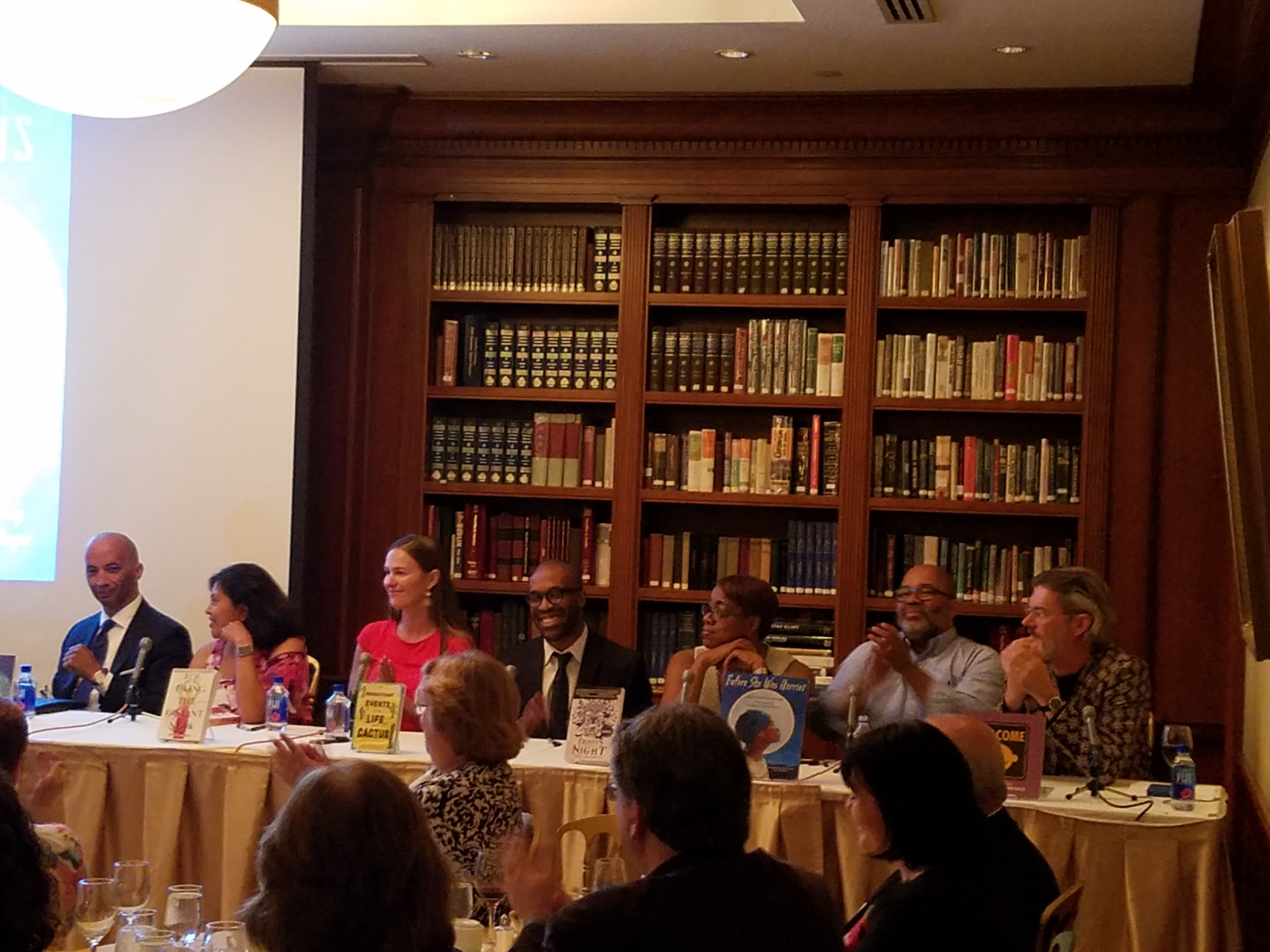 • The children’s author dinner at the Princeton Club was wonderful. The author lineup was fantastic: Byron Pitts (Be the One: Six True Stories of Teens Overcoming Hardship with Hope); Tochi Onyebuchi (Beasts Made of Night); Mitali Perkins (You Bring the Distant Near); author and illustrator husband and wife powerhouse Lesa Cline-Ransome and James E. Ransome (Before She Was Harriet), Dusti Bowling (Insignificant Events in the Life of a Cactus), and Mo Willems (Welcome). Each author (and illustrator) spoke about their books, and the publishers were kind enough to provide tote bags and copies of each book, which the authors graciously signed after their panel.