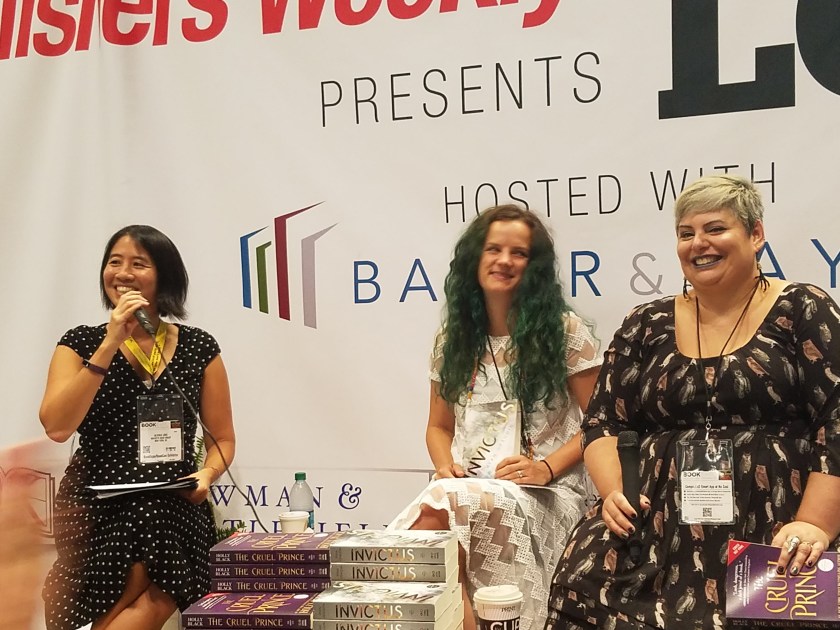 • Getting to sit in on Holly Black and Ryan Graudin’s talk about their upcoming books, The Cruel Prince (Holly Black) and Invictus (Ryan Graudin). Ryan Graudin talked about the influence of her Doctor Who fandom in writing this new novel, which shot it immediately up on my TBR. Holly Black could write the ingredients on a box of toothpaste, and I’d wait in line to read it. Both ladies were funny – Holly Black discussing her deadlines was laugh-out-loud hilarious – and engaging, and I’m thrilled that I got to see them.