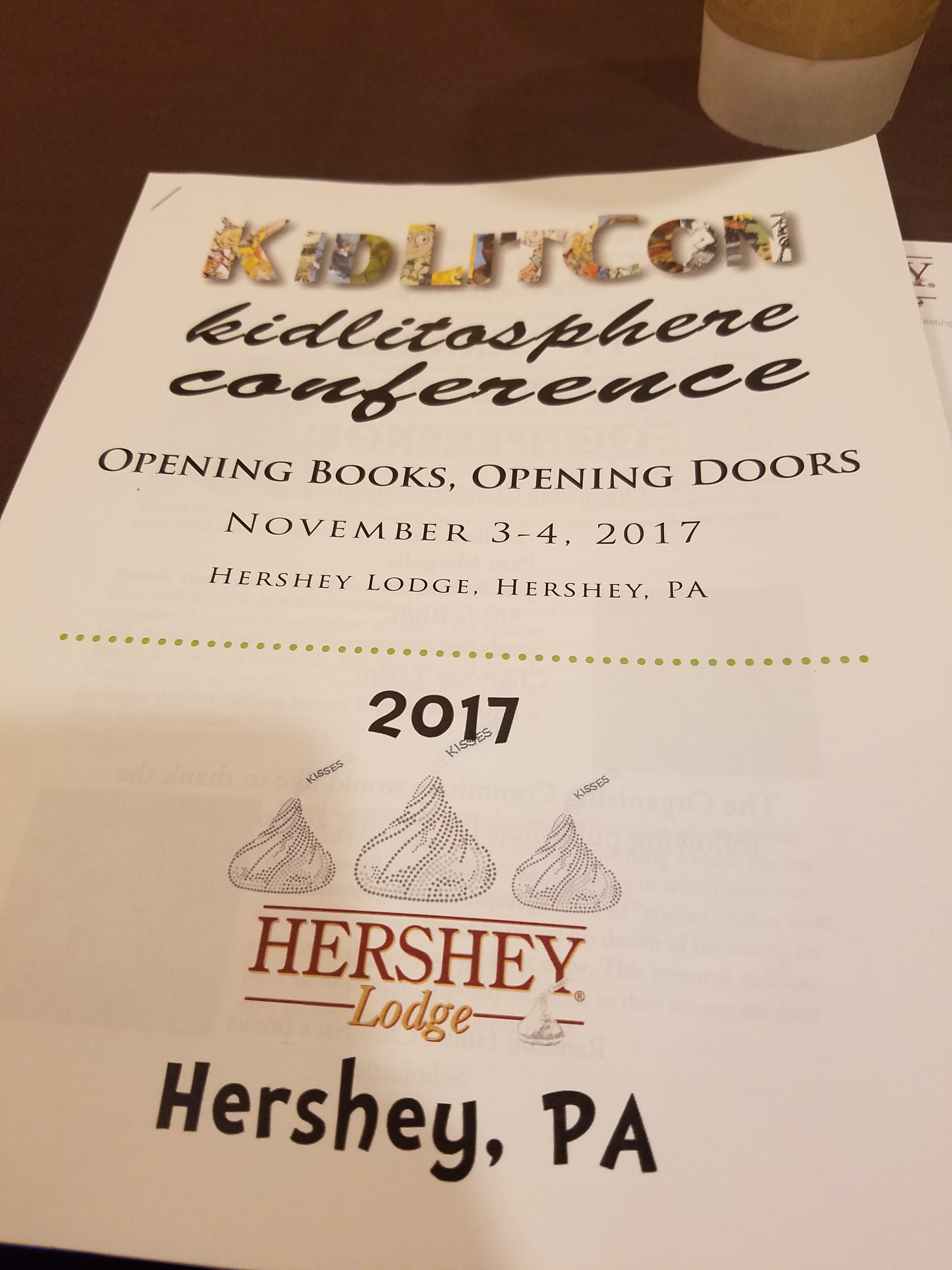 I was thrilled to be a speaker at KidLitCon this year! I’d wanted to go to the conference for the last few years, but this year, I was determined to go because it was pretty local for me: Hershey, PA. Once I received the invitation to be on a panel about bloggers and building relationships with authors and publishers, I was in! The Con is run by an incredible group of bloggers that I’ve admired since I was in library school; I was thrilled at the chance to finally meet people like Pam, The Unconventional Librarian, Sheila Ruth, fellow Tolkien fan and Cybils organizer, and Charlotte, whose speculative fiction reviews and Timeslip Tuesdays are the goods. And that’s just the tip of the blogger iceberg. I’m unpacking my brain, so this will be largely pictorial, with little bits of commentary; it was two fantastic days of learning, making new friends, and discovering new books. Can’t ask for better than that, right?