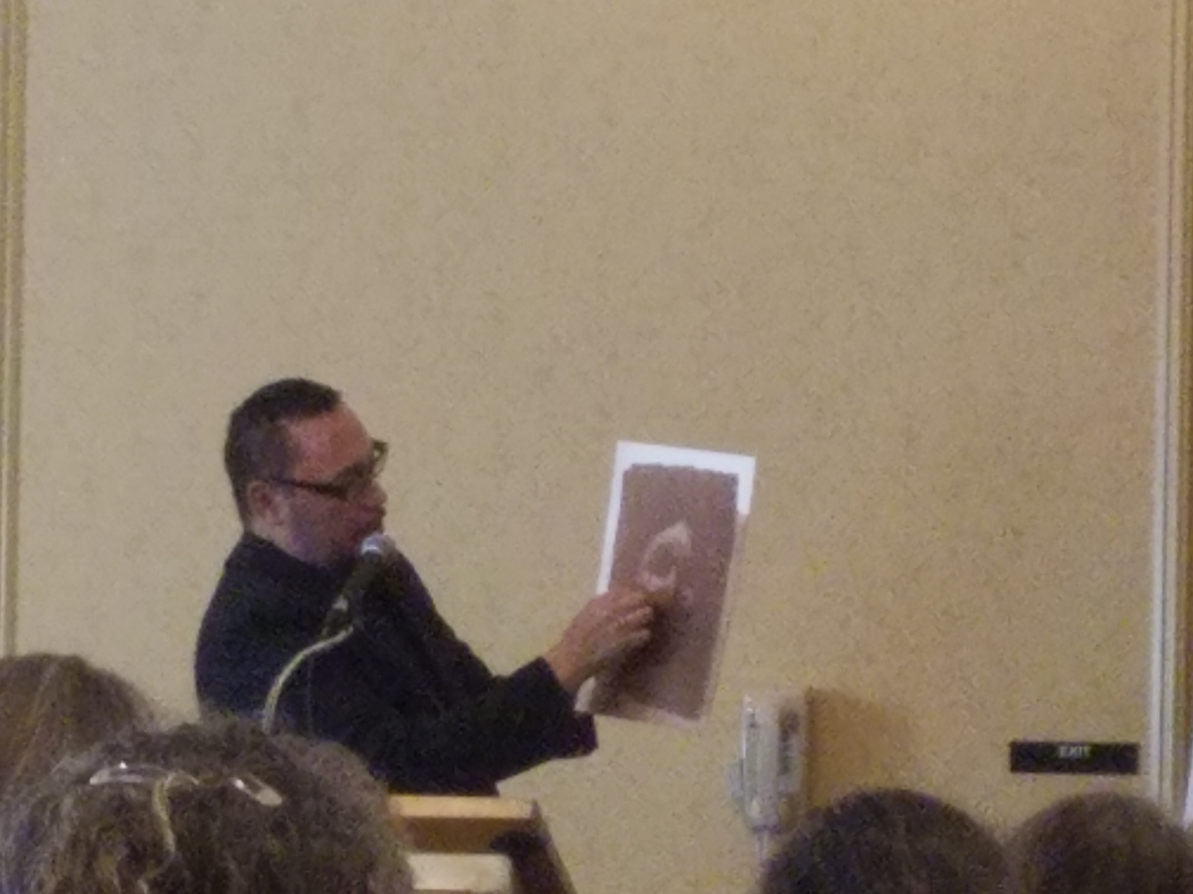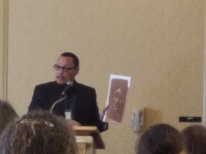 So, little did I know that illustrator Floyd Cooper was sitting in on our panel. That’s a doodle he left when the panel was over. A doodle! I’ve just about mastered the 3-D cube as my go-to doodle. This is why he is the illustrator and I’m the lady shoving his books into kids’ hands. During his afternoon keynote, Floyd talked about his “erasing” artwork – he treats a board with paint, gets a stretchy eraser, and goes to work. He created a portrait as he spoke, showing us how he works. I was in the back, so I know it’s not that great a picture, but it should give you a bit of an idea of how genius his work is. He stood up and called this image forth, as he was speaking, with an eraser.