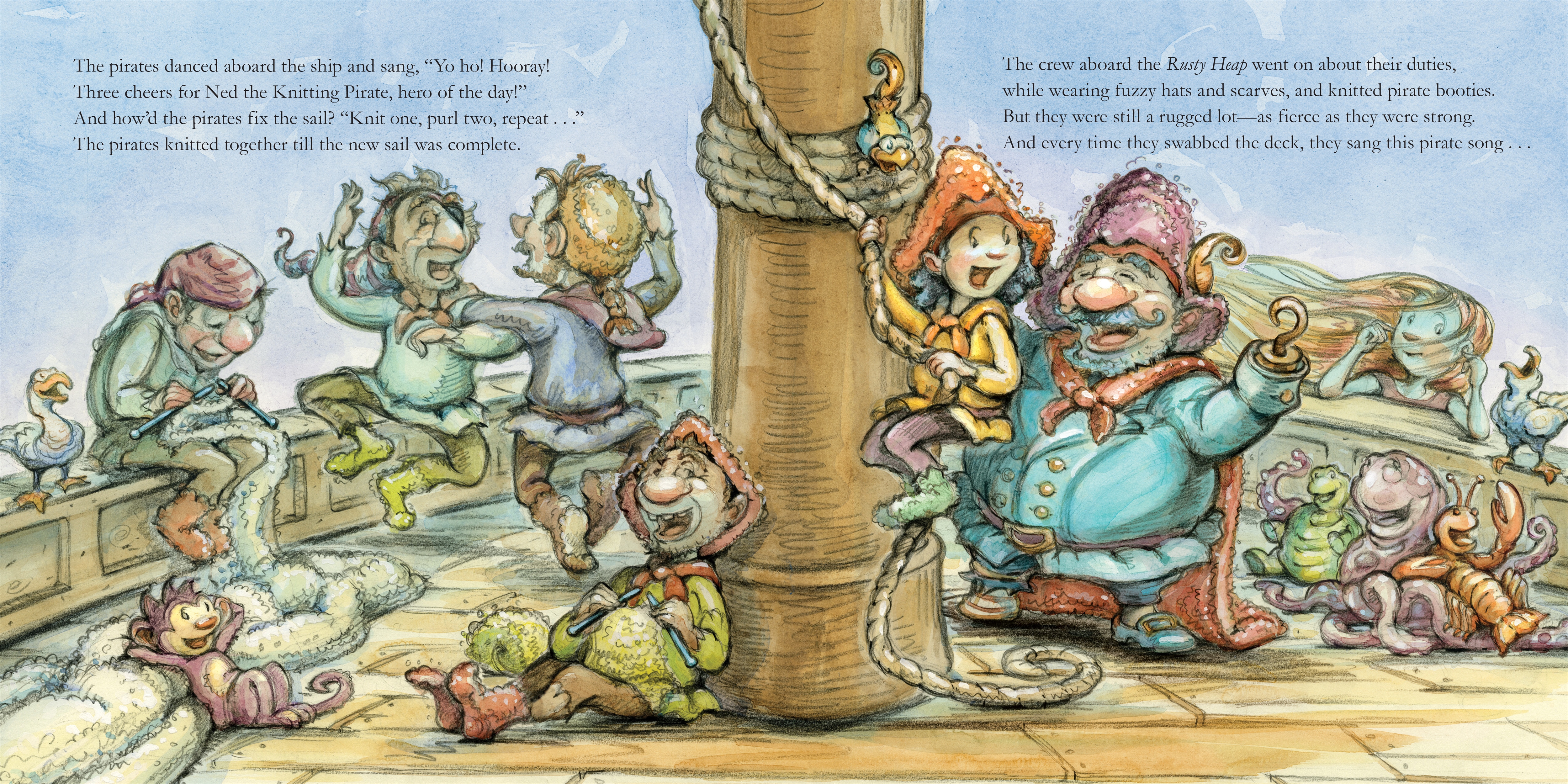 First of all, look at this art. It’s simply adorable. The endpapers start the fun, introducing us to a sea monster and a mermaid. The rhyming tale kicks right in, as we meet the crew of the Rusty Heap. They’re a scurvy bunch of pirates, “tougher than gristle and barnacle grit”… they brag about their pirate-y roughness time and again, only to have Ned cheerfully chime in that he knits every single time. The captain is not thrilled with this. Pirates don’t knit! Oh, really? He sure changes his tune when a sea monster attacks them, and the only thing that stands between the crew and Davy Jones’ Locker is Ned and his knitting prowess: he fires a blanket at the monster, which curls sweetly around him and sends him off to sleep. Like the best knits do!