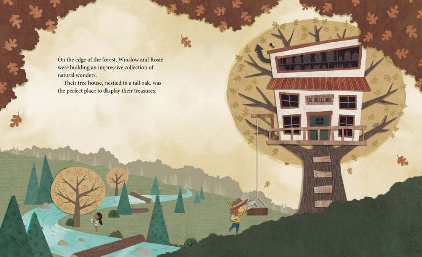 Two friends go on a nature expedition to find the perfect piece to complete their collection, only to discover a most outstanding wonder right outside their window in this STEM-inspired story. Alice and Winslow are two exploring friends who have their treasures on display in a magnificent treehouse, but they need one final piece to complete it. They go on an expedition where they discover amazing things, from a giant crystal to a buried T-Rex skull, but each new discovery is out of reach for one reason or other. When their last discovery – a very cranky bear! – sends them running back to their treehouse, they look over the accomplishments of the day and celebrate what they were able to achieve; an exciting noise outside draws their attention and reveals the most exciting discovery of all, right outside their window. The book has a great message about tenacity, discovery, and friendship. Budding naturalists and researchers will appreciate the collaboration and teamwork the girls exhibit, and the fact that they plan, journal, and catalog their findings. Alice Feagan’s cut paper collage illustrations add depth, encouraging the reader’s attention and capturing the varyious textures of different landscapes, like gritty stalagmites and stalactites to rough trees. The endpapers show off Alice and Winslow’s cabinet of curiosities.