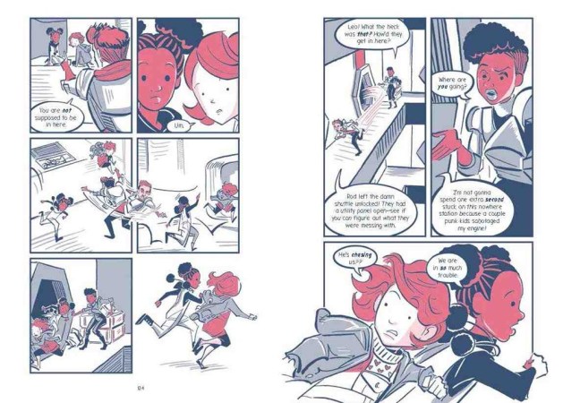 This is such a positive, fun read. The cast is diverse, with our two heroines coming from African-American and biracial (Latinx-white) families of prominence: Sanity’s dad is Wilnick’s station director, Tallulah is the daughter of the senior scientist. Her white dad rocks a man bun, prosthetic leg, and context clues allude to his being a celebrity heartthrob at some point in the past. There’s humor and technospeak that kids will love. The three-color white, purple, and pink artwork has bold lines and gives a real feel for the sheer size and scope of a space station.  Molly Brooks gives readers a vision of a diverse future where strong female characters are valued. A must-add to graphic novel collections – put this with your Zita the Spacegirl and Star Scouts books!