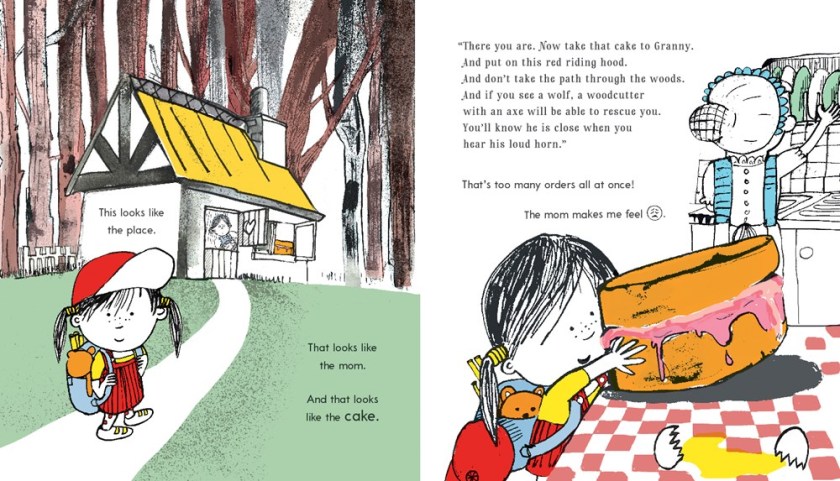 This flipped fairy tale serves as a cautionary tale when going camping. The Goldilocks family – Mr. Goldilock, Mrs. Goldilock, and Goldie Goldilock – head to the campground for a family trip, but sharp-eyed readers will see that the family is being watched by a curious bear, who wanders to their camp when the family goes for a hike. He samples their s’mores – too gooey, too chocolatey, juuuust right – and finishes the rest of the food, too; after all, “that’s how bears roll”. Bear tries out the family’s instruments, and finally, makes himself at home in Goldie’s tent, where he falls asleep. Baby Bear’s family arrives on the scene as the Goldilocks family discovers the mess, but as the family doesn’t understand bear language, Mr. and Mrs. Bear’s apologies and an invitation to come to their house for some porridge doesn’t go over well. The moral of the story: put your food in bear-proof containers when camping! Yaccarino’s illustrations are wonderful and have little details to enjoy, from Bear peeking out of the trees as the family arrives to a wolf confronting a young girl with a red hood at the story’s close. Horne’s storytelling makes for a funny, casual readaloud that will keep readers giggling. Pick this one up for your storytime collections.