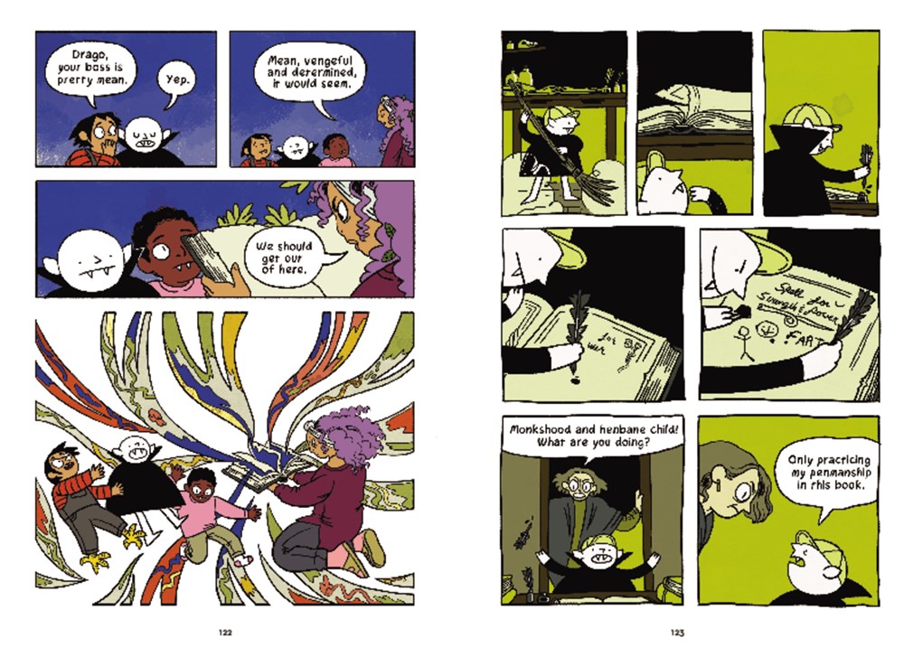 Back in 2021, I first met Eric Grissom and Will Perkins when I read their graphic novel, Goblin. I was hooked. It’s a gorgeously created graphic novel meditation on grief and loss, prejudice and acceptance with magic brimming over the edges of each page. I’ve only just read the second book in the series, published last year, and I cannot believe what I missed out on. Grissom and Perkins found a way to make a second volume of Goblin every bit as captivating and magical. The story begins with Rikt and Fish Breath, the goblin and wolf we met in the first story, seeking shelter from a storm in a fortune teller’s wagon, where Rikt is given a distressing prophecy. They flee the wagon, wolf hunters they encounter on the road, and end up the town of Silverkeep, where a woman named Miss Evelyn takes Rikt and Fish Breath to her “school for monsters”, separating Rikt from his wolf. Miss Evelyn isn’t all she claims to be, and she has pretty dark dealings on hand for her students. Rikt has to figure out how to get himself, Fish-Breath, and the other students away from Miss Evelyn before it’s too late.