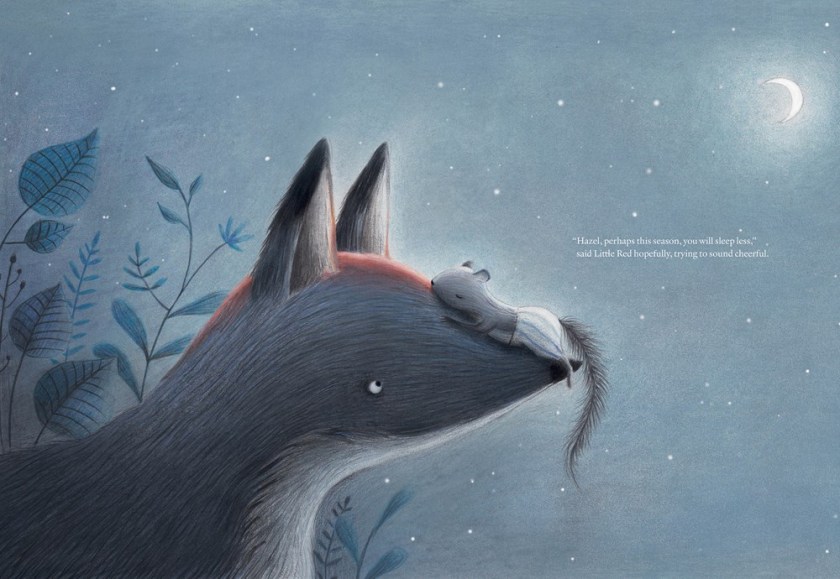 Originally published in Italian in 2019, this book is a touching, beautifully illustrated story about friendship and the pain of separation. A red fox and gray dormouse are the best of friends, but as the Fall closes in and the seasons move toward Winter, Fox is sad, knowing Dormouse will be hibernating soon: “For Red, the smell of winter meant one thing: loneliness”. Fox tries to think of ways to keep Winter away so Dormouse can stay awake and with Fox, but who can hold off Nature? Agreeing to share one more story, the friends curl up together… and sleep. The storytelling is gentle, full of love and yearning; the muted colors in the artwork let Fox’s bright coat stand out beautifully against the encroaching gray of Winter. Dormouse’s tilted head and soft words show a kindness and love for a friend; body language that immediately sends a comforting signal to readers. A lovely story of friendship and the fear of separation and loss; a warm feeling of knowing that your friends will be there when you open your eyes. Think about this one for possible grief and loss resources, too.