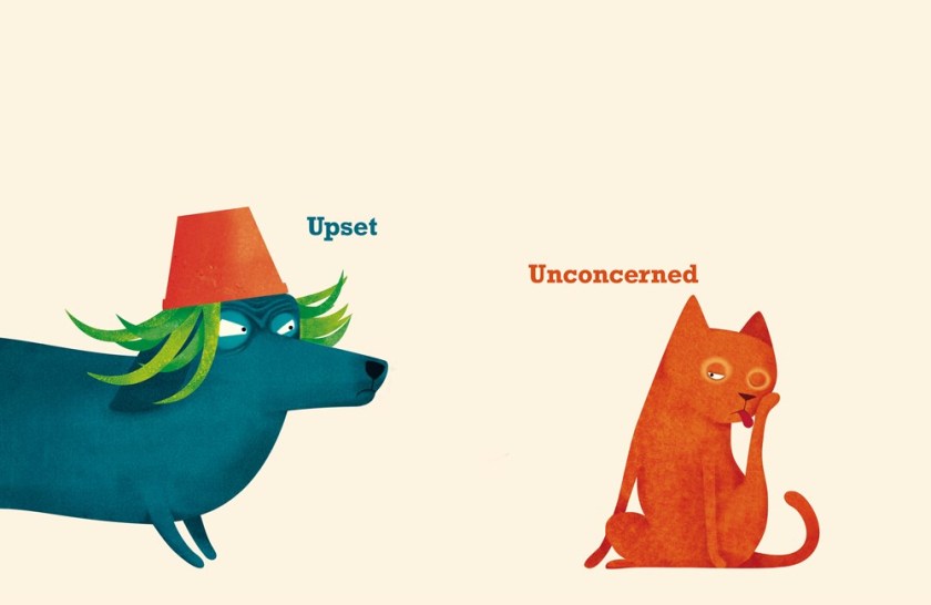 Concepts never made me laugh this hard. An orange cat and blue dog illustrate opposites in the most hilarious of ways as they go through a day of waking up, chasing one another, getting into trouble, and… being friends? Originally published in French in 2020, Taylor Barrett Gaines’s translation is spot on. Drowsy (and bored) Cat eyes sleepy Dog for Awake/Asleep; you just know what’s coming next. But the choice of Brave/Afraid is amusing and unexpected as Cat jumps on the startled Dog, whose eyes go wide, pupils as tiny pinpricks. My favorite spread? Upset and Unconcerned, which hilariously describe the action as Dog sports an overturned plant on his head as Cat blithely grooms. Fonts are in orange for Cat’s words; blue for Dog’s. A perfect combination of words and illustration, and a concept book that tells a cohesive story.