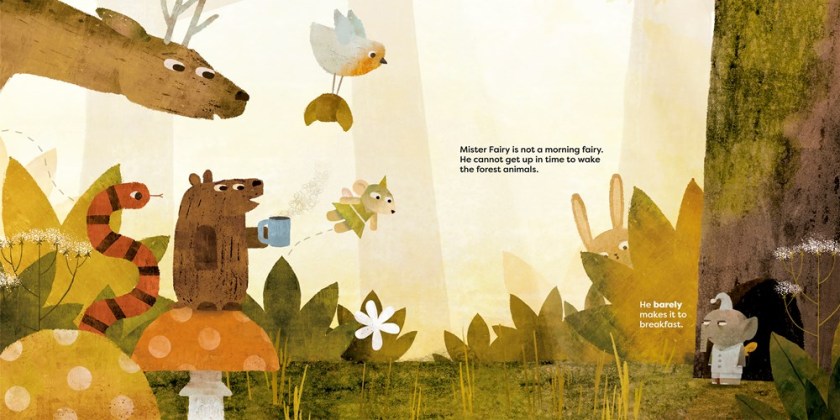 A forest full of animal-like fairies work their magic except for the taciturn Mister Fairy, whose spells never seem to match the other fairies. Depressed, Mister Fairy takes off to a dull, depressed city, where his seemingly backward spells are exactly what the citizens need: he adds much-needed splashes of color, tickling everyone with his wings and wand, and changing umbrellas into fluffy cotton candy. When he returns to the forest, he discovers that his friends have missed him there, too! A sweet story about embracing your talents, Mister Fairy was originally published in French in 2018 and is an empowering story about embracing your own gifts and uniqueness. Artwork reminds me a bit of Jon Klassen; the illustrations are colorful yet maintain a minimalist appeal. A fantastic back-to-school story about recognizing your own worth. Pair this one with Mister Tiger Goes Wild by Peter Brown.