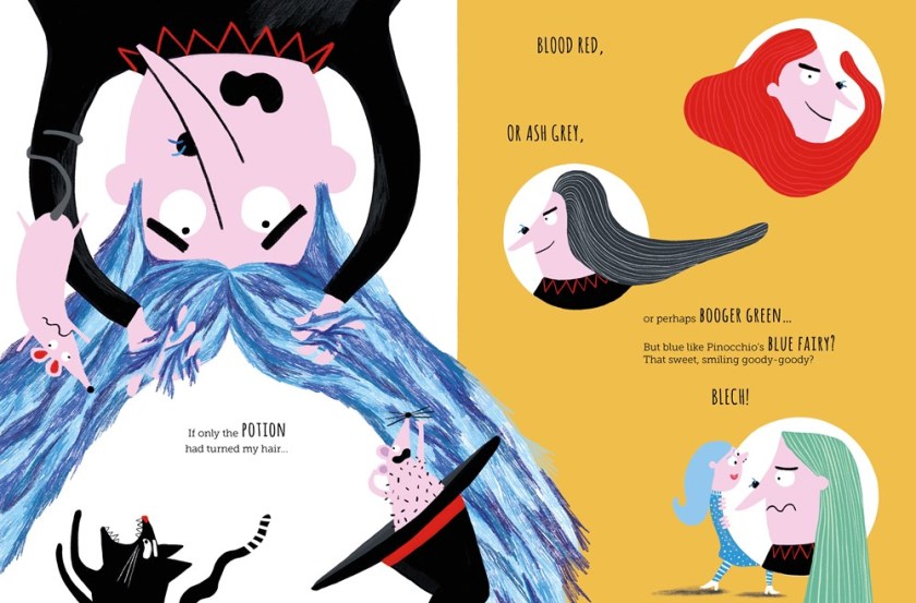 I love Leo Timmers’ bright, bold acrylics here. The bright colors and cartoony animal characters are a perfect accompaniment to Jean Reidy’s bouncy, happy rhyming text. Even the endpapers bring on the fun, with yellow, diamond-shaped construction signs featuring different animals working at different tasks leading readers in and out of the story.