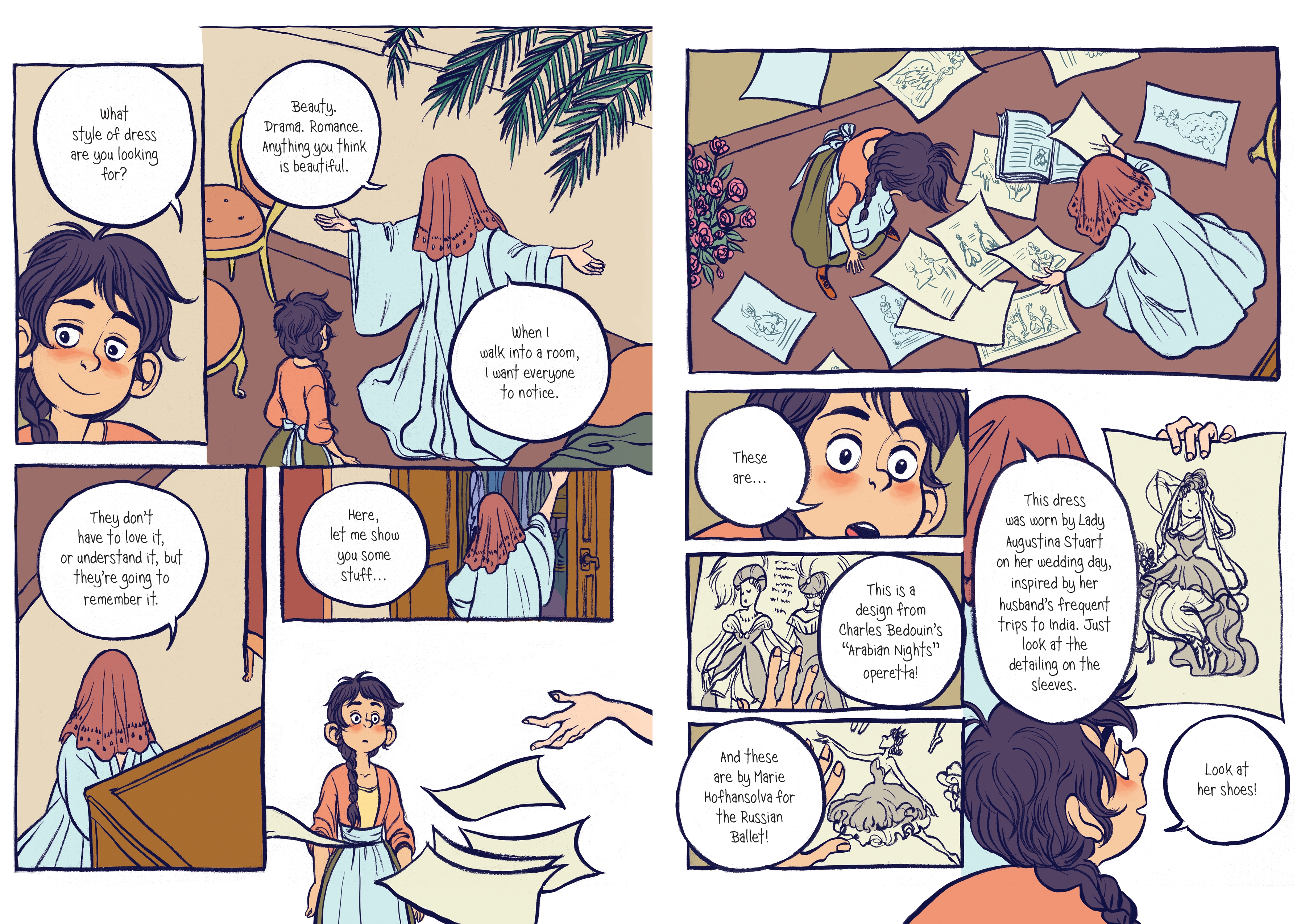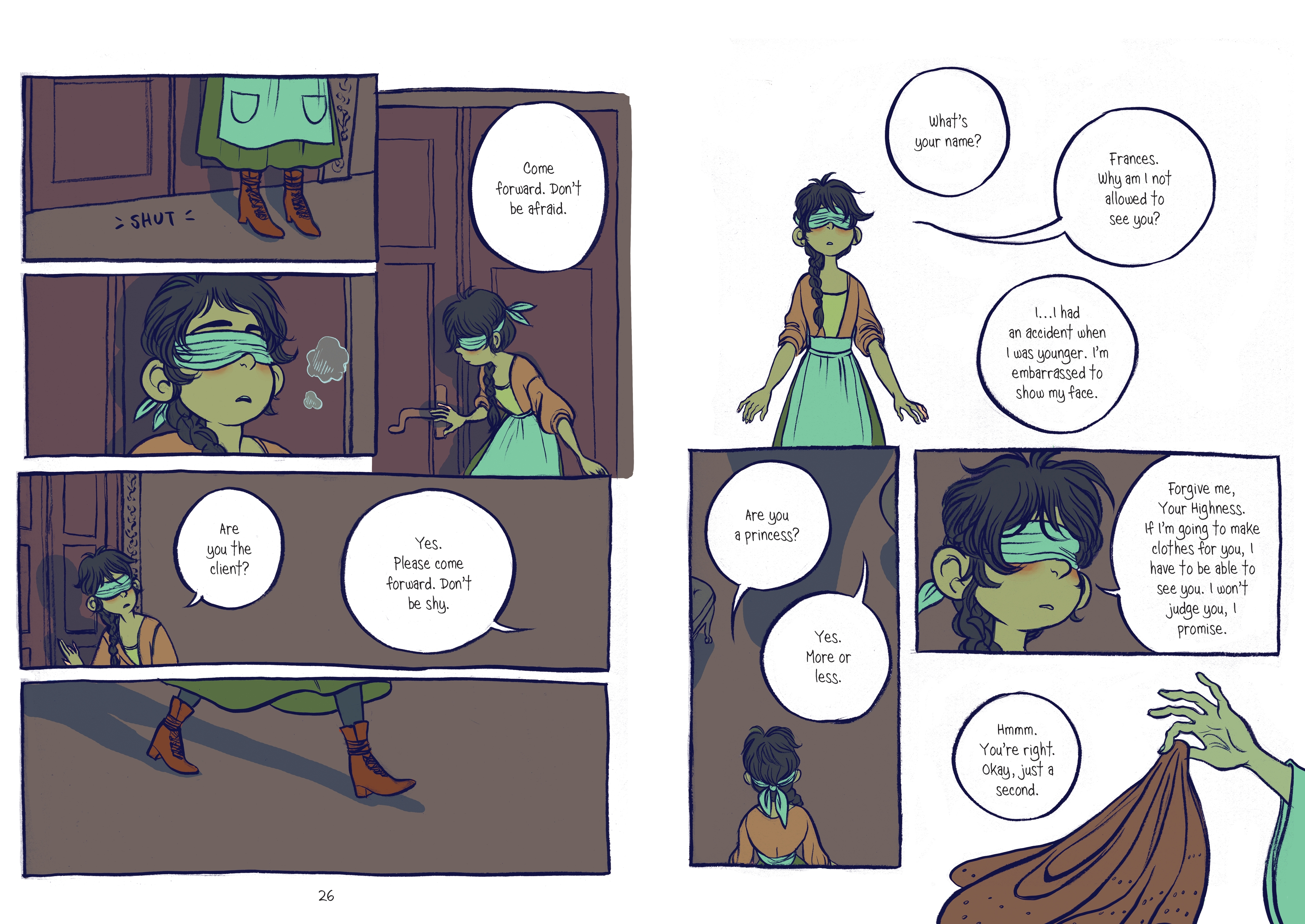 In a Parisian town, during what looks like a Renaissance period, Frances is a brilliant dressmaker who slaves away in drudgery until she’s hired to work for the crown prince, Sebastian. It’s only when Frances arrives at the palace does she realize that Sebastian has a secret: he loves to wear extravagant, lavish dresses and go out on the town! Together, he and Frances craft a persona, Lady Crystallia, and hit the streets of Paris together; Lady Crystallia makes a splash on the Paris fashion scene, and Frances finds her talents in demand. But to go public with her talents puts Sebastian’s secret at risk.
