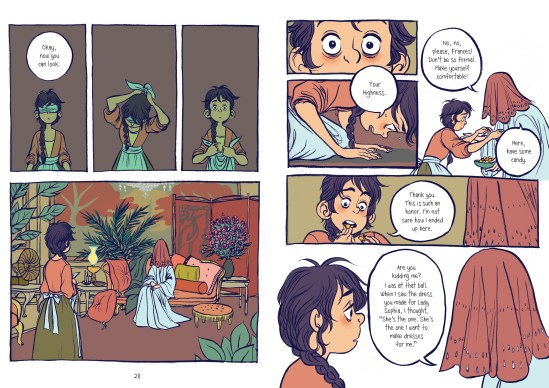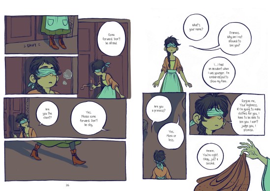 This is a great modern fairy tale. It challenges gender identity, it’s got great characters, the art is soft realistic with a touch of the fantastic, and a touch of sweet romance that will make you just sigh, “Aww!” Frances is a lovable character who I felt for, and Sebastian put my emotions through the ringer as he went through his own stress. Each chapter is set off with a dress pattern, keeping readers in the overall story. Give this one to your readers who loved Princess Princess Ever After, your Lumberjanes fans, and anyone who appreciates a good, modern fairy tale.