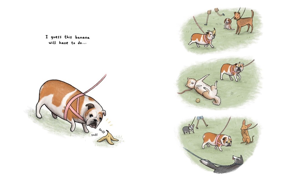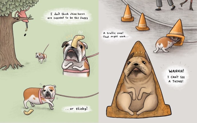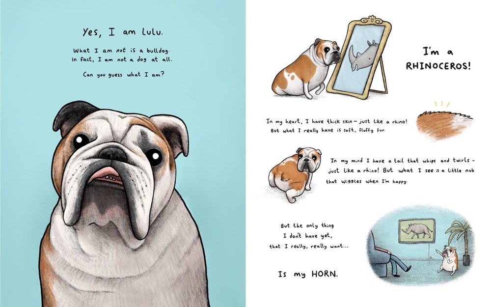 Lulu may look like an bulldog to you and me, but when she looks in the mirror, she sees a rhinoceros. In her heart, her fluffy, soft fur is really thick skin, and her nubby little tail is actually whiplike. The only thing she needs is a horn: then everyone will know she’s really a rhino! But as she searches for her horn, others laugh at her and cruelly mock her; her Cinderella-like search for the perfect horn takes a few sweet, giggle-worthy turns, especially at the ice cream cart. When Lulu wanders into a rhino enclosure at a zoo, she meets a friend who uses common sense to see her for who she is, and they come together to form a mutually beneficial, wonderful, friendship.