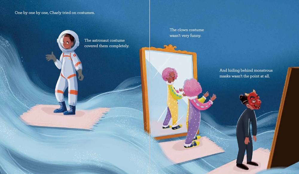 Halloween is coming, and bigender Charly wants to find a costume that “showed they were both a boy and a girl”. After trying on multiple outfits that either hid them or swallowed their masculine or feminine identity, Charly gets to work and makes their own costume that makes them feel as fabulous, frightening, and fantastic! Cartoon art meshes with realistic artwork to give readers a brown-skinned bigender child aware of themselves and unwilling to settle for anything less than perfect. Charly’s confidence and creativity are uplifting; their friends’ supportive reactions are important for readers to see. Details throughout Charly’s room encourage both halves of their identity. A note on nonbinary and bigender identities and resources for further reading make up the back matter. A good first purchase for collections.