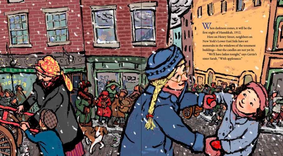 Back matter includes a glossary, an author note putting the story into historical context and her own relationship with Sydney Taylor’s books. An illustrator note talks about Paul Zelinsky’s deliberate decisions when making choices for the story’s artwork. There’s also a link to extra back matter, including downloadable coloring pages, educator resources, and a latke recipe.