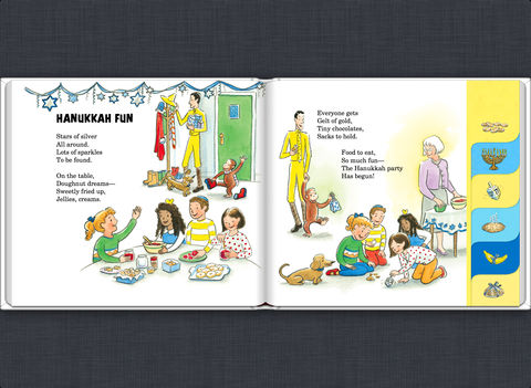 Six short rhyming stories show readers how Curious George and the Man with the Yellow Hat celebrate Hanukkah with friends. Each story, tabbed for little fingers to turn quickly to, looks at a different moment in the eighth night celebration: George and his friend wrap gifts and head out visiting; they arrive and the party begins; the Man in the Yellow Hat (with his hat respectfully off) lights the menorah, George and the children spin the dreidel, George tries to help makes latkes; George and the kids play; and finally, George does a mitzvah by cleaning up and packing up some latkes to take to a sick friend.