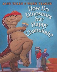 Selina Alko evokes big holiday feelings and childhood excitement here. Her gouache, collage, and colored pencil on watercolor paper artwork is bold and colorful, contributing to the excitement and anticipation of the holidays, and she brings Judeo-Christian traditions together with fun and childlike joy. A timeline at the end of the story illustrates all the holidays Sadie and her family celebrate together, from Hanukkah/Christmas (Kwanzaa gets a mention, but the family here is white) through to Easter and Passover, and Thanksgiving. Endpapers are colorful portraits of Sadie and her parents, and include icons for each holiday: a dreidel and a menorah, a tree and an angel. Inspired by the author and her husband’s decision to integrate each of their religious backgrounds into their home for the holidays, Daddy Christmas & Hanukkah Mama is a lovely addition to holiday collections and storytimes.How Do Dinosaurs Say Happy Chanukah?, by Jane Yolen/Illustrated by Mark Teague, (Sept. 2012, Blue Sky Press), $16.99, ISBN: 978-0545416771