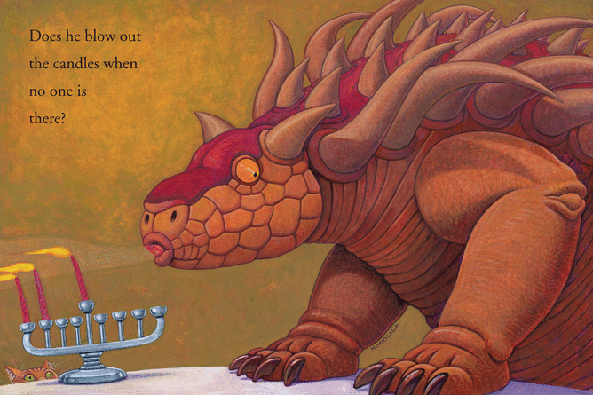 Those misbehaving dinosaurs are here to demonstrate what to do – and what NOT to do – during Chanukah! We see Rugops fuss through prayer and Nodosaurs blow out menorah lights while Ichtyostega writes his own name on everyone’s gift cards and Chirostenotes grabs all the gelt, all while horrified parents bear witness. But we know that’s not really what dinosaurs do when they celebrate Hanukkah. Camarasaurus shows readers that dinosaurs sing every prayer, and Chirostenotes is sharing the gelt and taking turns with the dreidel. Dinosaurs give Bubbie and Zaida holiday kisses, and then head off to bed.