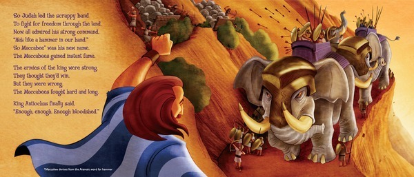 This is a very readable, child-friendly history of the struggle behind the celebration of Hanukkah. The rhyme scheme is simple and easily falls into pattern for a readaloud. A repeated phrase, “Sometimes it only takes a few, Who know what’s right, and do it, too”, brings home the message embodied by the Maccabees: see the need to do the right thing, and do it. It takes bravery, it takes strength, and it takes determination; here, the Maccabees model the behavior and inspire readers.