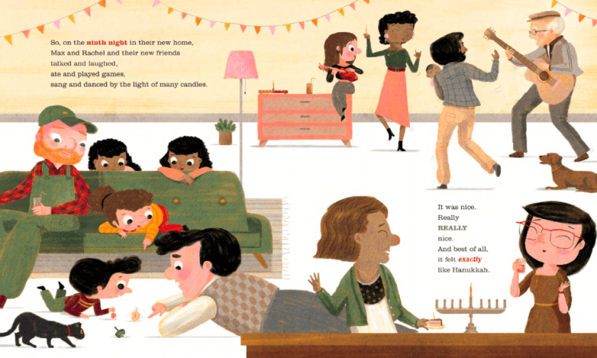 The artwork is bright, with a realistic cartoon feel: think of Judah Maccabee like a buff superhero. The spreads are full-bleed and colorful, with movement across the pages to keep little eyes engaged. Back matter includes a brief backgrounder on the festival of Hanukkah. This one’s a fun addition to holiday collections; it’s more history-based, yet still includes the focus on family that is central to the celebration.
