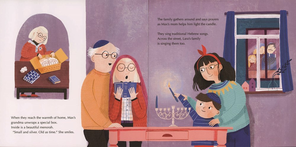 TL Derby’s illustrations are bold and vibrant; both Silver Menorah and Dreidel have expressive facial expressions, and Silver Menorah looks sparkly and textured, like a mixed media rendering using foil.