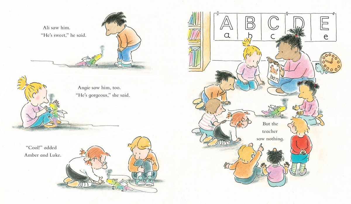 Three kids and their puppy friend are in search of fairies! While their moms relax, the explorers head into the woods on a wordplay adventure that gives We’re Going on a Bear Hunt vibes: “River rushes icy cold. / Step, / hop, / hop. / Splish-splash… / into the misty magic”. The group encounters all sorts of flora and fauna, but where are the fairies? Readers who keep an eye on the canine companion may see a fairy or two before the kids do – there’s playful magic to be found if only you look! The story is a light-hearted walk through a magical world that makes for a lively storytime. Fun storytime tip: flannel fans can create some fairies for readers to place on the flannel board. Pencil, watercolor, and collage illustration sets a magical stage for the story; the woods seem to glow with magic in the background on the opening pages, and the sprites bring a whimsical joy with them when they appear. Endpapers give readers a lay of the land, with fairies transparent yet visible for sharp eyes. Fairy Walk is magical and playful and a do-not-miss addition to storytime collections.