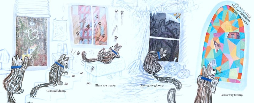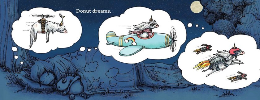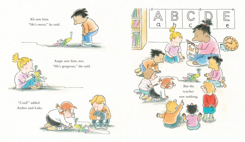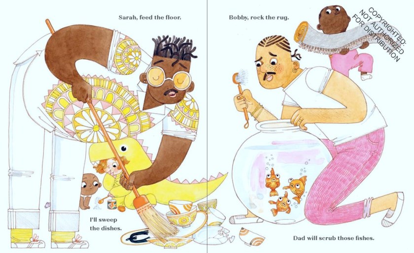 It’s all about imagination and sounds with this storytime between a father and child. Starting with the two reading a story – why, they’re reading the same book we are! – there’s a statement: “Let’s be bees”. The next spread expands on the fun as parent and child turn into bees, the accompanying statement reading “Let’s be fuzzy, buzzy bees and BUZZ!” The two turn into chitty, chatty birds (“CHIRP!”), lofty, leafy trees (“RUSTLE!”), and a host of other nature and animal sounds. It’s great fun made for an interactive storytime with onomatopoeia and alliteration to keep kids’ interest with wordplay. The two even mimic each other for a delightful close to a perfectly fun story. The crayon artwork beautifully matches to the playful theme. Do not miss this one; it’s an essential add to storytime collections.