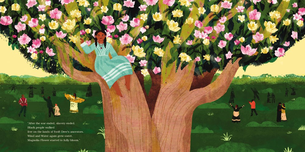 National Book Award Winner Dr. Ibram X. Kendi adapts Zora Neale Hurston’s short story, “Magnolia Flower”, for children in this gorgeous tale of an Afro-Indigenous girl and the man she loves. Magnolia Flower is the daughter of an escaped slave named Bentley and an Indigenous woman named Swift Deer, who “had fled her own trail of tears”. Their daughter, Magnolia Flower, falls in love with a man of letters, but Bentley wants more for his daughter and tries separating the two; Magnolia Flower makes a decision to follow her heart. Dr. Kendi beautifully retells Hurston’s tale for young audiences, assuring that her legacy will continue. Loveis Wise’s digital illustrations have a gorgeous folk art quality to them, with vibrant color and a strong connection to nature. Colorful magnolias embellish the endpapers. Back matter includes a historical note on the setting of “Magnolia Flower” and an author’s note on Hurston’s work. This is the first of six classic works by Hurston that Kendi will adapt for younger audiences. A breathtaking book that deserves a place in any collection.