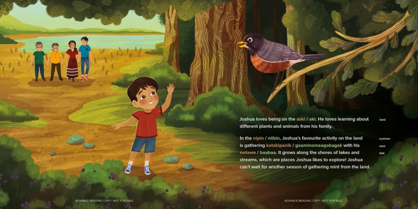 Dad, is it Time to Gather Mint? celebrates the relationship between humans and the land as a First Nations child and his family move through the seasons. Told in three languages: English, Swampy Cree (n-dialect), and Anishinaabemowin, the story is narrated by Joshua, a young boy who revels in his relationship to the land; his favorite time of year being mint-gathering season. Josh and his dad spend time together in nature through Fall, Winter, and Spring; he drinks in the colors and feels of the surroundings of each time of year. In the Fall, he sees the leaves change color and animals prepare for the winter; in the Winter, the cottony snow brings the cold. In Spring, he sees the animals return and the land come back from a winter’s sleep, and in Summer, he feels the longer, warmer days and rejoices in the green around him. Each season he asks Dad if it’s time to gather the mint, and each time, his father describes what other work must be done: hunting moose and partridge in the Fall; ice fishing in the Winter; hunting geese and fishing for rainbow trout in the Spring. Finally, the Summer arrives, and with it, the time to gather mint! It’s a moving story of family and stewardship to our world. Vocabulary in Swampy Cree and Anishinaabemowin are color-coded in brown and green throughout, with English translations in the margins. Back matter includes a glossary and pronunciation guide along with a recipe for Mint from the Land Iced Tea, just like Joshua’s mother makes. A moving and important addition to season books for collections.