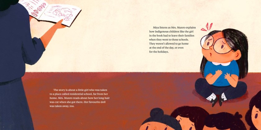 A young Indigenous girl learns about residential schools in her class, making her fear that she will be sent to one. When Miya arrives at home from school, she reluctantly tells her mother about her concerns; her mother assuages her fears, telling her that the schools have closed and she will never have to attend one. When Miya questions why her teacher read a book about them, Mom notes that “We all need to understand the truth of what happened, so we can make sure it never happens again”.  Mom tells Miya about wearing an orange shirt as a way of remembering the struggles of Indigenous children, and Miya proudly wears when she returns to school. John-Kehewin shows the intergenerational trauma wreaked by the schools and how it reaches the current generation. Medina’s illustrations have cultural details and her characters are inclusive and expressive. An author’s note mentions her inspiration for Miya’s story. A powerful and moving story about residential schools as seen through the modern-day eyes of an Indigenous girl, Miya Wears Orange belongs in library collections everywhere.