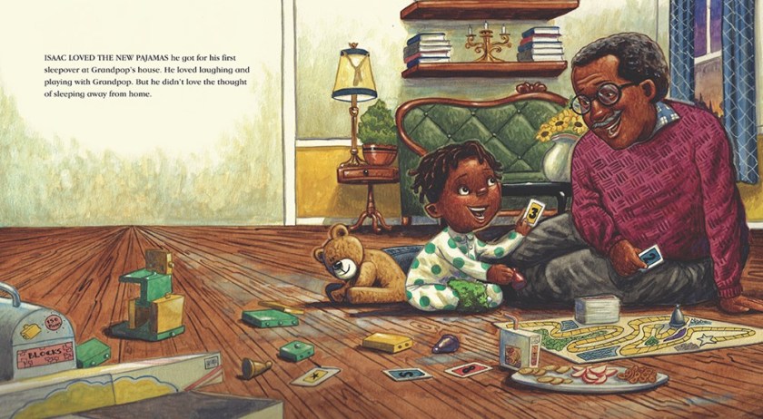 Rica – short for Frederica – is so excited! Her Grampy’s coming to visit for their Adventure Week: it’s the one week a year he’s off from work, and they always have exciting things planned to do together and with her best friend, Laini. This year, though, Grampy arrives on crutches and a bandaged ankle. He’s sprained his ankle, and Adventure Week is now Stay-venture Week! Rica, Grampy, and Laini come up with some fun ideas for Stay-venture Week, but Rica is worried that Grampy’s not having enough fun. What’s a kid to do? This second book in the Rica Baptista series is a light-hearted story with a glimpse into Cape Verdean culture and a warm intergenerational relationship at the heart of the tale. Grampy is a playful, fun-loving grandparent who’s happy to eat his fill of candy and tell “almost true almost all of the time” tall tales. Rica’s parents are very present and involved. Black and white illustrations run throughout and include excerpts from Rica’s prayer journal, where she hopes for her grandfather to feel better and to do well at the talent show. Rica and her family are brown-skinned; best friend Laini is light-skinned and of Irish descent. The next book in the Rica Baptista series is out in November – pick up the first two now and get them on your chapter book shelves.