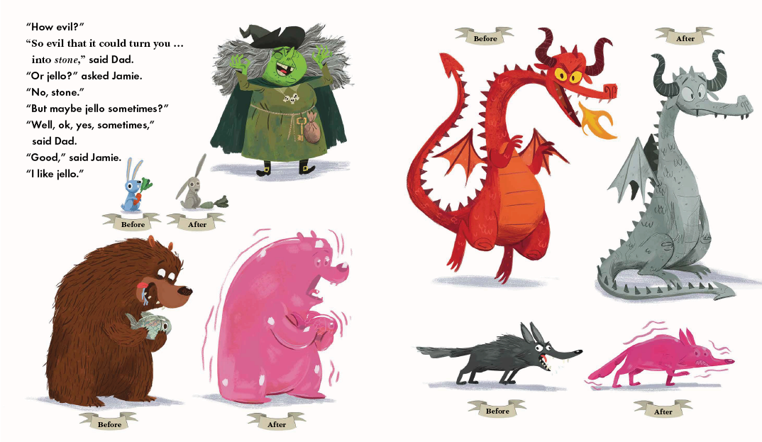 The storytelling family from The Prince and the Witch and the Thief and the Bears and The Tale of the Valiant Ninja Frog are back! In this latest installment, Dad is working from home on a rainy day and siblings Jamie and Abby are BORED. Luckily, it’s not too difficult to tear Dad away for a quick story! This time, the awful Doktor Drab is using his horrible Boron Beam to make the whole universe as dull as he is. What to do when the usual heroes fall victim to the beam? Call in the Space Pirate Bears! There’s one problem, though: Jamie and Abby can’t agree on whether the Space Pirate Bears are unicorn doctors, secret agents, or ninjas, and the whole universe hangs in the balance! This fun adventure is all about compromise and teamwork, and makes for a fun read-aloud. Colorful illustrations are eye-catching, with fun details for readers: the siblings’ toys are characters in the story, and readers familiar with the previous entries will recognize some familiar faces. Endpapers show the space pirate bears in a variety of action poses. A fun additional purchase for storytime collections.